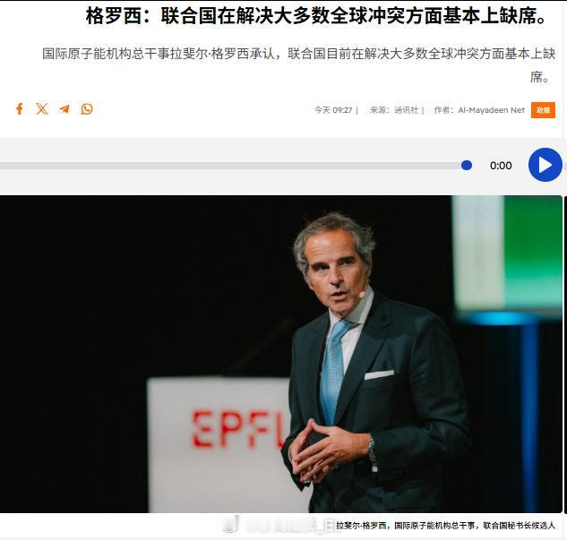 据媒体报道,国际原子能机构总干事、联合国秘书长候选人拉斐尔·格罗西表示,联合国目前在解决大多数全球冲突方面基本上缺席,该机构应该重新发挥这一作用。 对此有网友表示:位置不是别人给的,而是自己争取的。