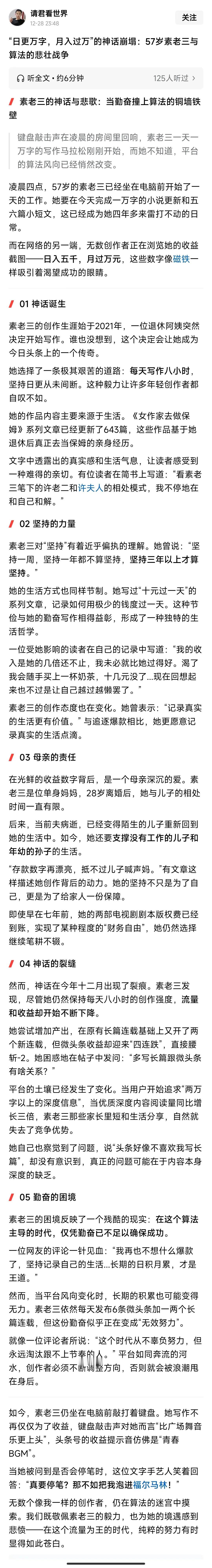 素老三在头条是一个颇具争议的人物,其实她本身是个作家,但是这些年大家都知道作家的日子并不好过,于是她迅速转换赛道到头条来,成为一个普通创作者。 尽管只是一个普通创作者,但素老三本身有很好的文字功底,所以她在头条还是比其他创作者要混的要好的很多,尤其是近些年来,很多普通创作者的收入大幅断崖式下降的时候,素老三的创作收益反而飞速上涨,这让她有些飘了,于是天天在头条晒收益,这让很多头条的普通种族者嫉妒她,对她有了看法,于是很多人就在头条想方设法的抹黑她。 刚刚刷到的这位作者对素老三这人进行了充分的挖掘,对素老三有兴趣的可以看一看,这样可以有利于大家更好的了解素老三,从而对她有一个正确的全面的评价。