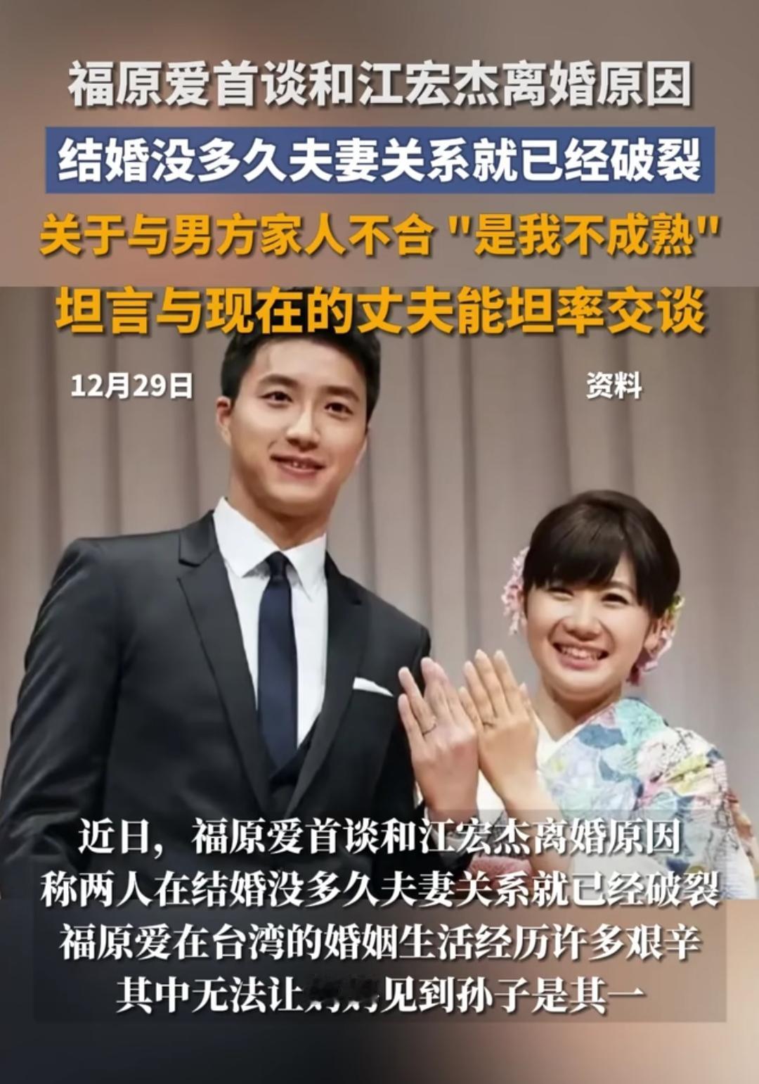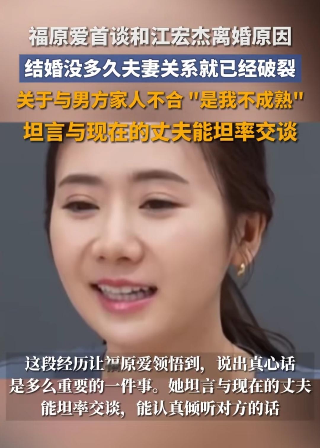看福原爱最新采访时突然鼻酸——曾经在镜头前笑眼弯弯、连说中文都带着软糯感的姑娘,提起和江宏杰的婚姻,轻描淡写一句“结婚没多久就破裂了”,背后藏着多少个哭着去工作的清晨? 当年全网磕的“跨国恋童话”,最后以一地鸡毛收场。有人骂过拉扯,有人叹过遗憾,可如今她坦诚“那时候的自己不够成熟”,才懂成年人的感情里,哪有绝对的对错。不过是两个不懂如何磨合的人,在婚姻里撞得头破血流。 现在的她能和前夫坦率交谈,不是原谅了过往,而是终于和当年那个无助的自己和解。原来好的成长,从不是揪着对错不放,而是看清生活真相后,依然能温柔待己。 婚姻从来不是1+1=2的简单叠加,而是两个不完美的人,慢慢学会包容与承担。愿我们都能在感情里少点遗憾,多点清醒与勇敢。