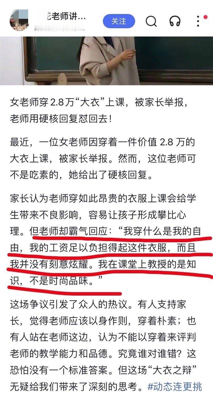 女老师穿2.8万“大衣”上课,被家长举报,老师用硬核回复怼回去!