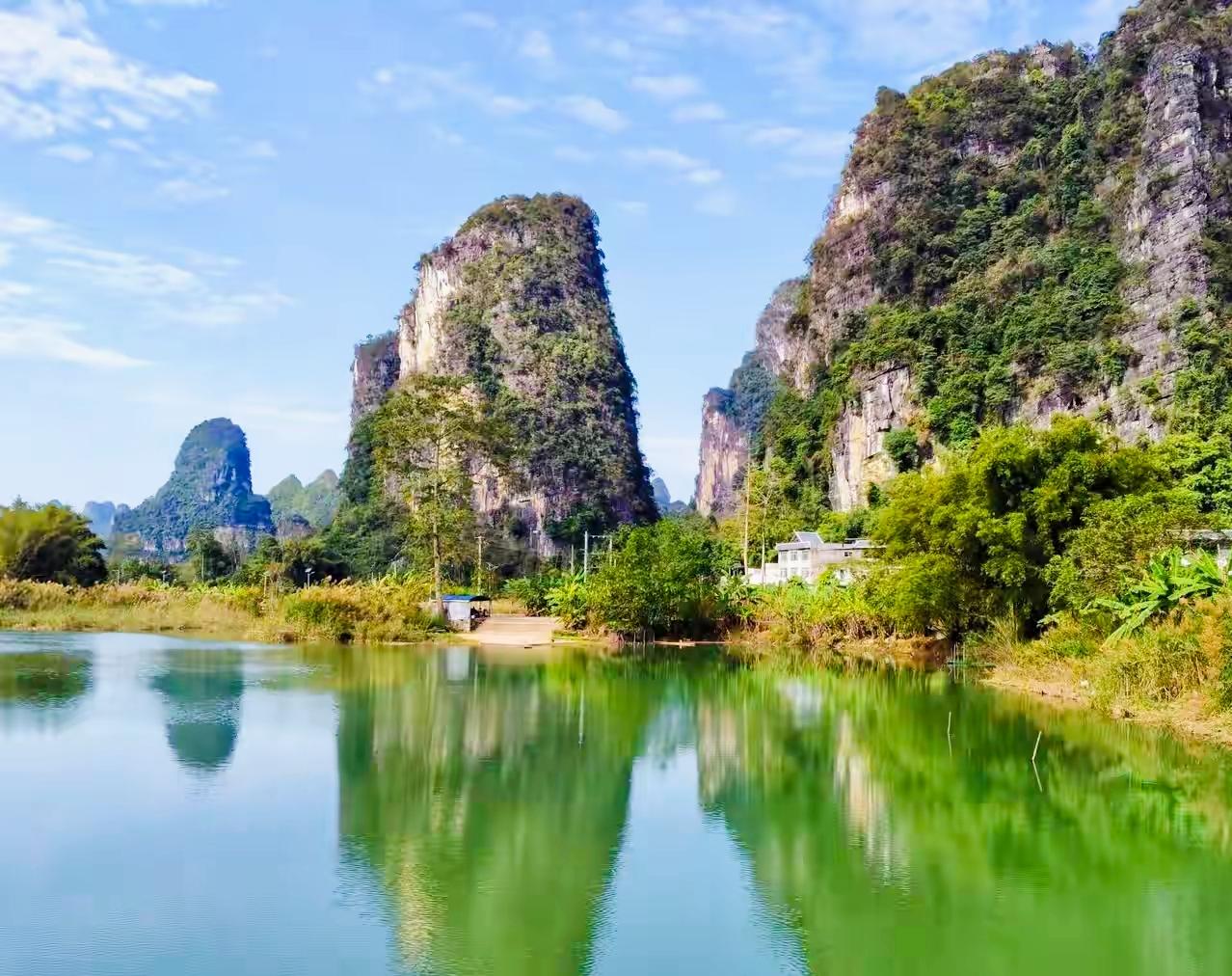 家乡美:仙境般的桂林山水,静谧的湖面倒映着碧绿的山峰,仿佛置身于世外桃源。