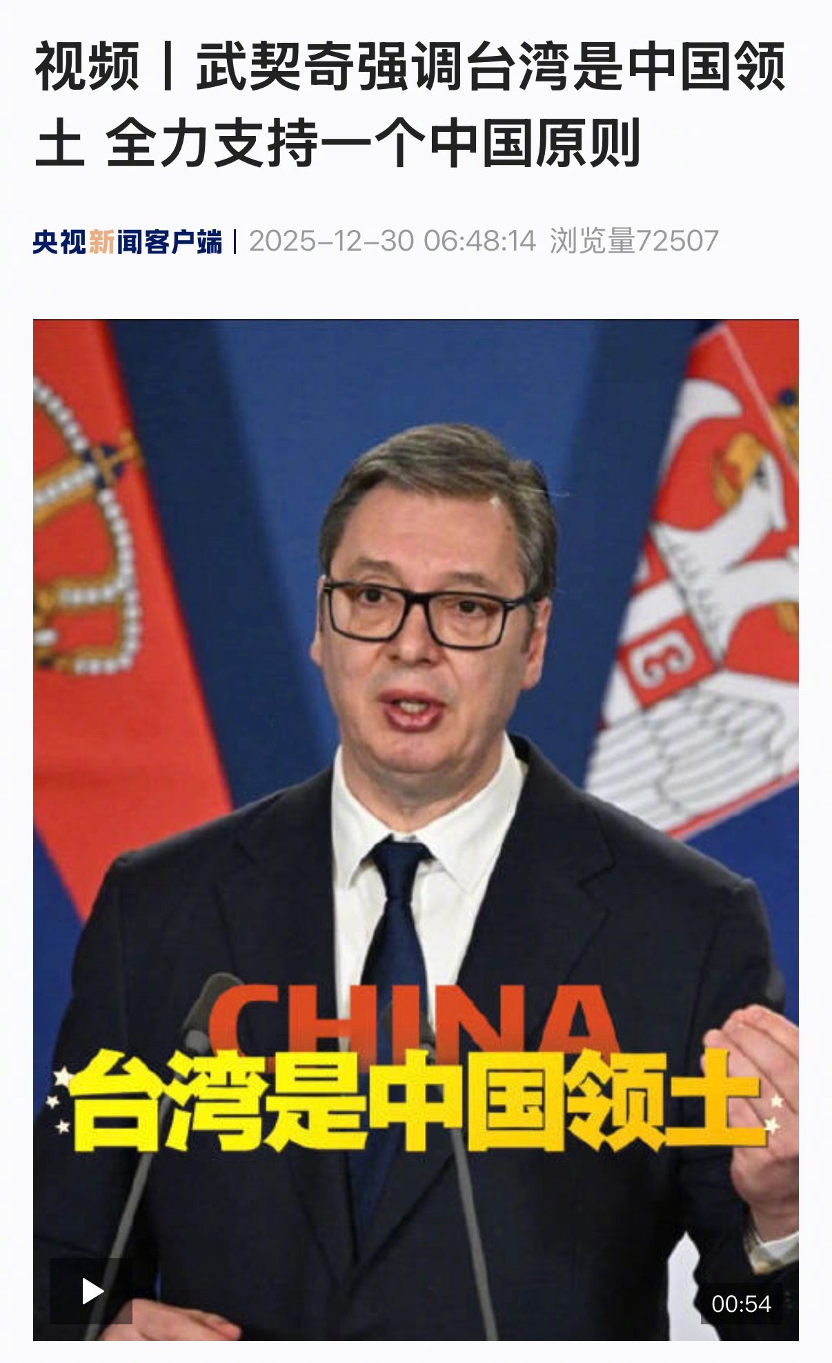 【武契奇强调台湾是中国领土 全力支持一个中国原则】当地时间12月29日,塞尔维亚总统武契奇视察了由中国企业承建的“多瑙走廊”快速路项目建设现场,慰问施工一线的中塞两国员工,并对中国国家领导人、中国企业和建设者表示感谢。武契奇强调,台湾是中华人民共和国的领土,塞尔维亚以全部政治力量支持一个中国原则,支持中华人民共和国。(央视新闻)#新闻联播出现台北101大楼画面##解放军无人机俯瞰台北101大厦##东部战区随时到台北#