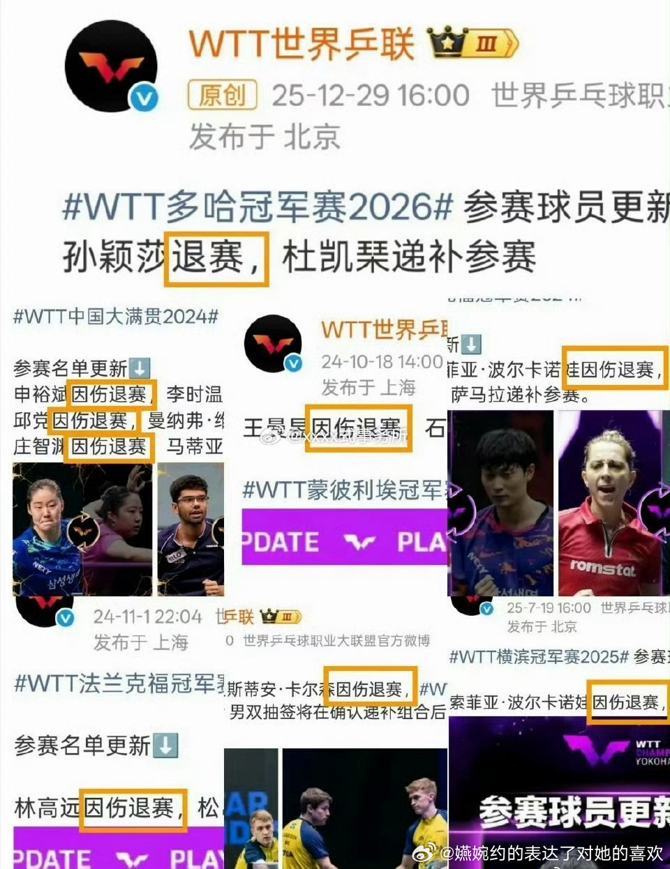 孙颖莎退出多哈冠军赛赛程严重不合理七个小时三赛导致的孙颖莎因伤退赛,为什么不能写一下呀