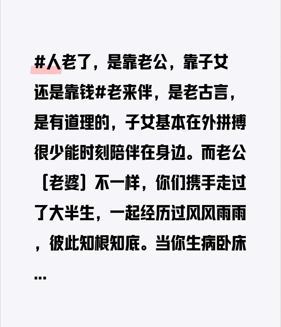 不过,仅有老来伴也不够,钱同样重要。手里有钱,心里不慌。在老年生活中,难免会有各种突发状况,比如生病就医。有足够的积蓄,就能在需要的时候及时得到最好的治疗,不用为了费用问题而发愁。而且,有了钱,还能让自己的生活过得更有品质,可以去旅游,去参加各种兴趣班,丰富自己的精神世界。 当然,子女也并非完全靠不住。他们虽然不能时刻陪伴,但那份亲情是割舍不断的。在一些重大决策上,子女的意见和支持也能给老人很大的力量。而且,当老两口之间有矛盾时,子女还能充当和事佬,调和家庭关系。所以说,人老了,老公、子女和钱都很重要,它们相互补充,共同支撑起幸福的晚年生活。