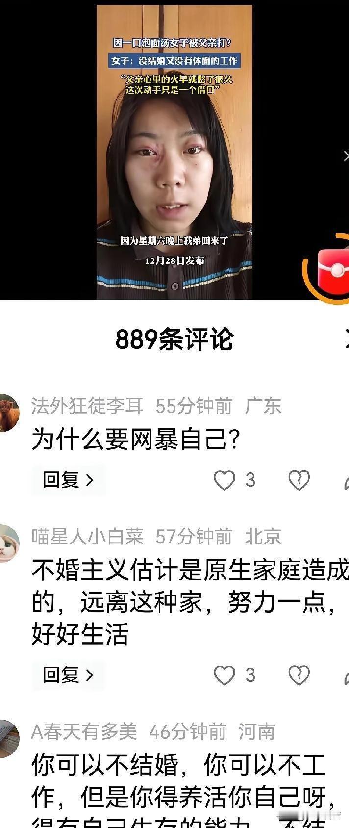 一女子在网上控诉被自己爸爸打了,起因是她不婚在家,还没有体面的工作 一女子不婚在