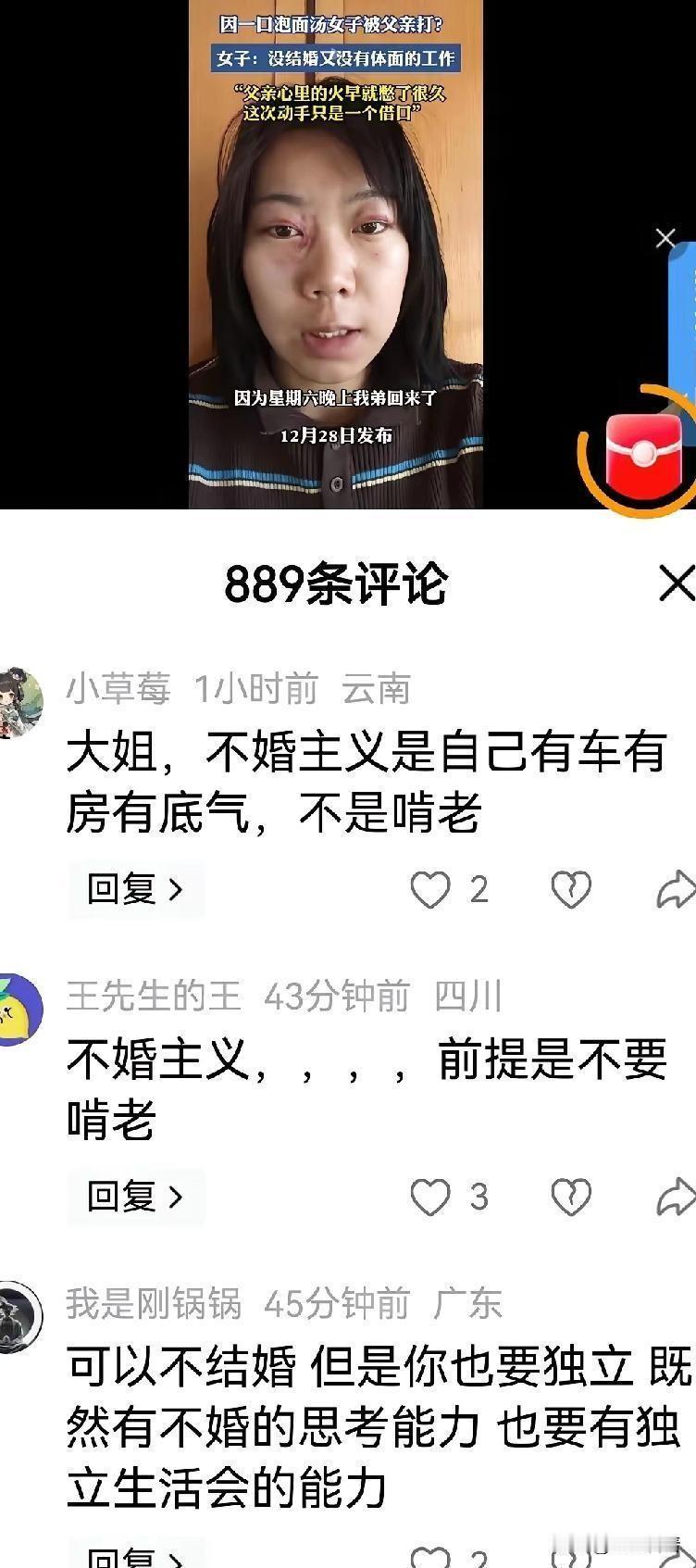 一女子在网上控诉被自己爸爸打了,起因是她不婚在家,还没有体面的工作 一女子不婚在家没工作,跟弟弟要泡面汤被父亲骂,她瞪父亲后被打,结果评论区反转,没人骂父亲反而说她啃老不对 自己都成年了还在家啃老,还好意思跟弟弟要泡面汤喝?不婚本身没错,但啥都靠父母养就是不对,被父亲说两句瞪人,挨打也怪不得别人吧 婚姻选不选是自己的事,但经济独立是必须的啊!自己没工作啃老,哪来的底气跟人横?网友说的真对,自己挣的钱才硬气 父母养你到成年已经够意思了,你不工作还在家待着,凭啥让父母为你的不婚买单?弟弟的泡面汤都要蹭,也太没出息了吧 真正的自由不是躲在家里啃老,是能自己养活自己啊!哪怕日子简单点,也比靠别人强,自己有底气才不会被说 现在一想到女子成年啃老还跟弟弟要泡面汤,被打骂后还被网友说,就觉得成年人必须经济独立,不然连基本尊严都没有。你们怎么看