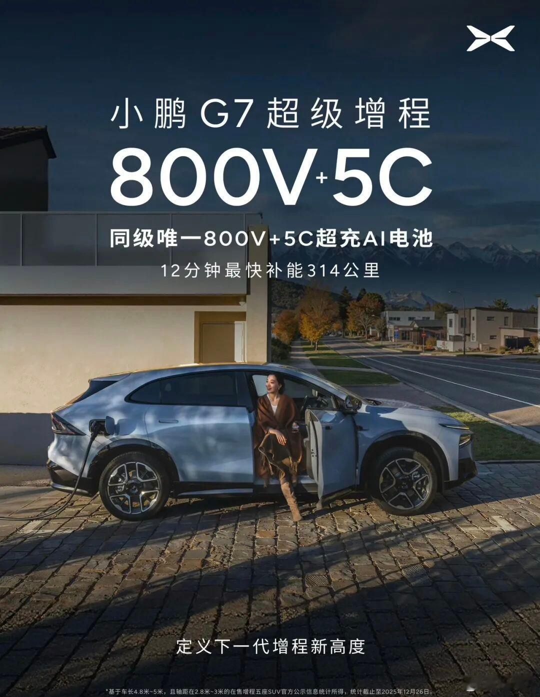 1704公里超长续航SUV小鹏G7来了【G7增程版综合续航1704km,2026年一季度上市 起售价20万内?】超长续航:新车搭载55.8kWh大容量磷酸铁锂超充电池+60L大油箱,达成CLTC纯电续航430km、综合续航1704km超快充补能效率拉满:标配小鹏5C超充AI电池+800V高压架构,支持12分钟快充补能314km(10%-80% SOC)高效低耗+亲民用油:搭载第三代1.5T高效增压中冷增程器,匹配全栈高集成高压油冷发电机,实现WLTC亏电油耗仅6.4L/100km,油电综合油耗低至2.53L,且全系支持92号汽油;即便亏电状态下,仍能保持150km/h高速稳定巡航强劲动力:后置后驱布局,搭载218kW永磁同步电机,峰值扭矩450N·m,0-100km/h加速6.5秒,最高车速202km/h,搭配前双叉臂+后五连杆独立悬架、智能可变阻尼减振器大v聊车 。