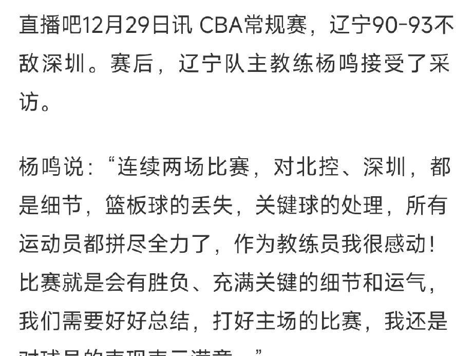 虽输给深圳!杨鸣这场比赛对去全队很满意! 辽宁男篮三连客三连败,最后3份惜败深圳赛后,杨鸣指导似乎看开了,这场比赛没有说球队打的不好,反而夸赞球员都拼尽全力,对所有球员都很满意! 三连败后,辽宁男篮全队以及辽宁男篮球迷彻底卸下了包袱,对球队的期望值进一步降低,因为赛季初赢了广厦,开局3胜1负,让很多球迷误以为辽宁男篮这赛季依旧很强,从三连败后球迷似乎看开了!
