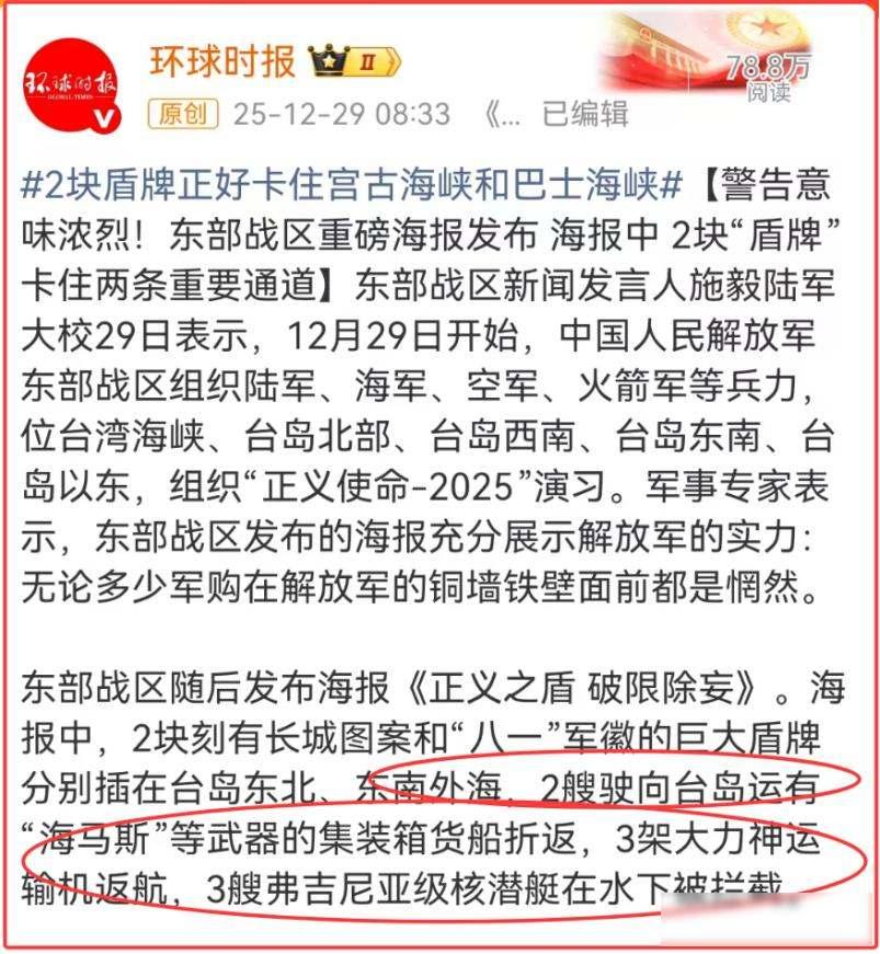 12月29号早上,东部战区没打招呼就展开“正义使命—2025”演习,陆军、海军、空军、火箭军全都参加,舰艇、飞机、无人机和远程导弹一起出动,演练内容很实际,包括海上搜索潜艇、空中突破防线、对陆地模拟打击和封锁港口这些实战项目,台湾方面完全没反应过来,前一天晚上还在播放赖清德的讲话。