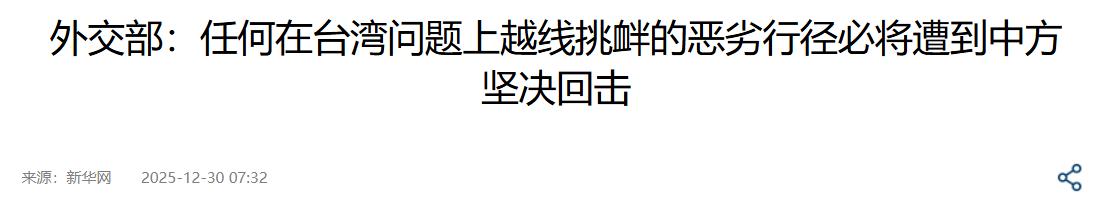 日本察觉不对劲!2025年12月29日,日媒报道:解放军此次军演是对赖清德和高市早苗言论的警告!外交部作出回应! 我国多次重申针对台湾问题的立场,但仍旧有部分国家频繁干涉。就在最近这段时间,以日本为首,美国等一些国家纷纷介入我国的内政问题,并且挑衅力度持续加大。 针对这种行为,我国在发布多则警告后,直接采取了最直接的方式,那就是围台军演。就在2025年12月29日的时候,中国人民解放军东部战区就组织开展了军事演习。 此次的军事演习目的非常的明确,而在我国展开军事演习后的第一时间,国际媒体就高度关注此次的军演,尤其是日本媒体。 在当天日本媒体就针对此事进行了大肆的报道,其中有一家日本媒体称中国军方宣布,在台湾周边地区举行军事演习,就是严重警告台独势力和外部势力的干涉。 同时强调解放军的此举就是对赖清德,以及高市早苗“台湾紧急状态言论”的错误。确实,我国此次军演包含这些目的。 随着讨论热度越来越大,在当天的时候外交部就对此事做出了回应。外交部就明确回应称,解放军展开有关军事演习,就是对台独分裂势力的严厉惩戒,更是捍卫国家主权和领土完整的必要行动。 台湾问题是我国核心问题中的核心,针对台湾问题,我国的立场绝对不会发生更改。国际众多国家应坚定认可并奉行一个中国的原则,而不是试图阻挠中国统一的进程。 对此,您怎么看?欢迎评论区留言您的看法。 (信息来源:外交部:任何在台湾问题上越线挑衅的恶劣行径必将遭到中方坚决回击-新华网) (信息来源:[突发新闻]中国军方宣布在台湾周边举行军事演习,"严正警告台独势力和外部干涉势力"--此举是对赖清德政府和高市首相"台湾紧急状态"言论的警告。-TBS NEWS DIG)