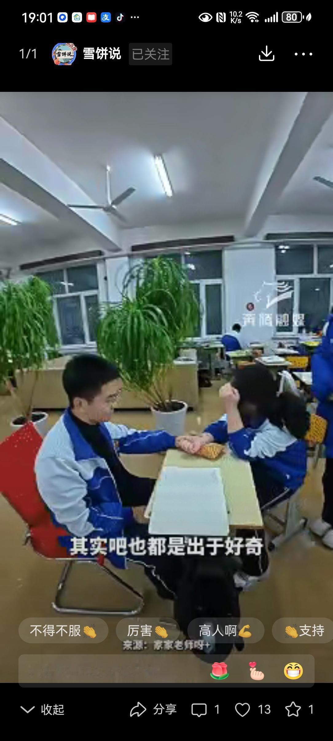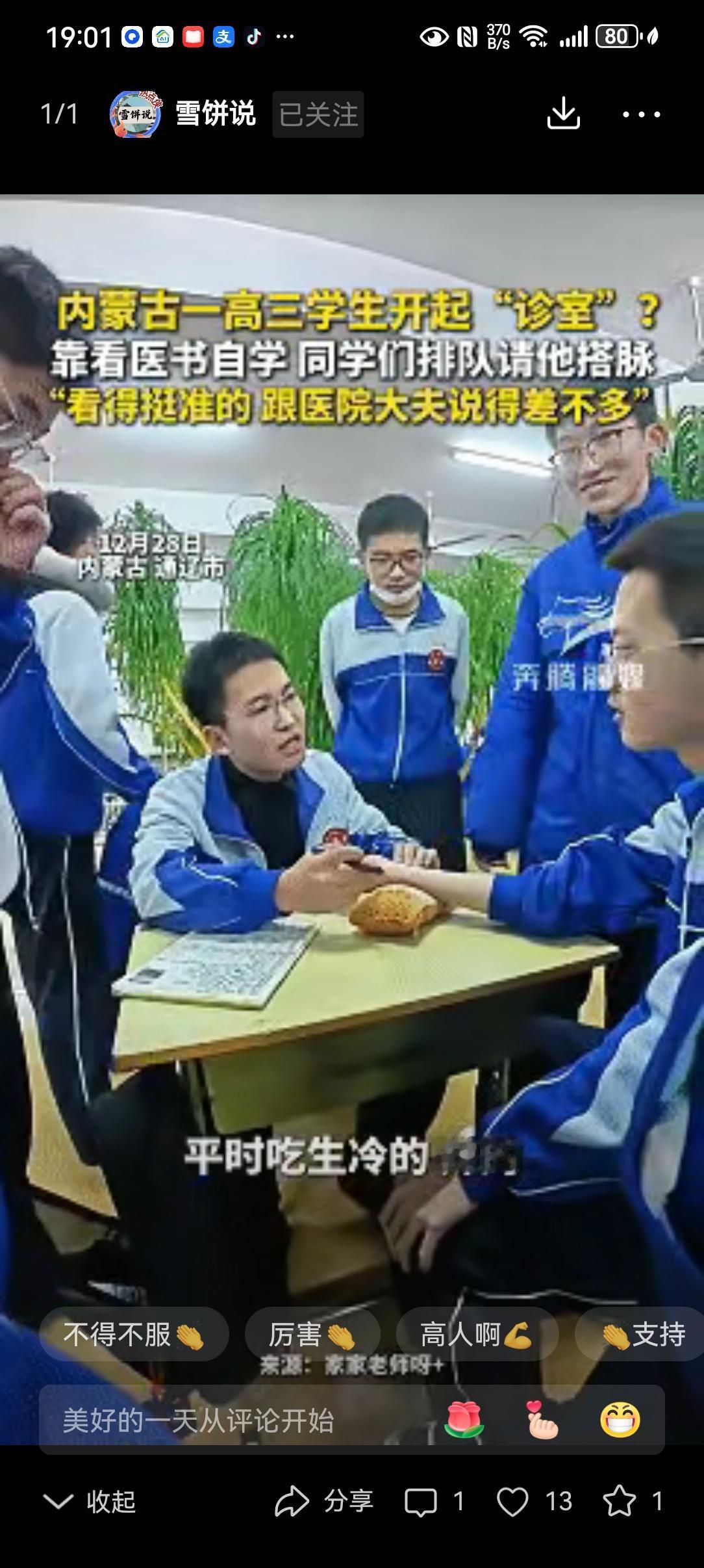 中医后继有人了!内蒙古通辽,一老师课间休息时,突然听到班里同学说别的班“中医”出诊了,本以为是个玩笑,结果发现真有一帮同学在排队把脉,不过看病的人并非大家印象中的老中医,而是一个穿着校服的男孩 刘老师起初是不信的。这般年纪,本该是捧着课本啃公式的光景,怎么就摸起了脉?可眼见着前排的学生把手腕搁在桌沿,那少年眉头微蹙,指尖轻搭,倒真有几分模样。 这少年的家底,说起来也寻常。家里堆着几本泛黄的古籍,是祖辈传下来的医书。他打小就爱翻,那些拗口的汤头歌诀、晦涩的经络图,竟被他嚼出了几分滋味。 头一回给同学把脉,不过是课间的玩闹。谁曾想,他随口说的“你这几日怕是熬夜多了,脾胃虚得很”,竟一语中的。消息传得快,找他瞧脉的人便多了起来。 平日里,他是个随和的性子,笑起来眉眼弯弯,和旁人没两样。可一搭脉,神情便沉了下来,手指在寸关尺上细细探着,像在听什么隐秘的声响。 说完脉象,他也不藏着掖着。哪里是久坐伤了筋骨,哪里是贪凉亏了气血,都慢条斯理道来,末了再添一句“早睡几日便好”的叮嘱。 排队的人里,有真觉着身子不爽利的,也有纯粹好奇来凑热闹的。奇的是,好些人都说,他讲的竟和医院里大夫说的差不离。 这便不是蒙的了。没有三年五载的琢磨,那些医书里的字,断断不能化成指尖的分寸。 总听人叹,中医的传承难,难在年轻人不肯沉下心。可这少年,却在课桌之间,把老祖宗的东西,玩出了实实在在的模样。 他如今的把脉,终究是校园里的小打小闹,算不得正经的行医。可谁又能说,这般从兴趣里生出来的热爱,不会在日后长成参天大树? 若他真能循着这条路走下去,考进医科大学,把这指尖的本事,化作救死扶伤的能耐,那中医才真的是后继有人。 中医的火,从来不是靠喊出来的。是靠一个个愿意低头翻古籍、肯伸手摸脉象的人,一点点焐热的。这校服少年把脉的模样,叫人看见了几分希望。