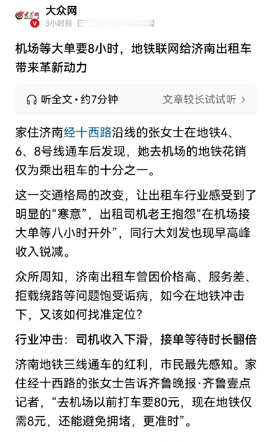 济南出租车网约车面临崩盘:轨道交通不一定取代开车的,不一定取代骑电动车的,但一定