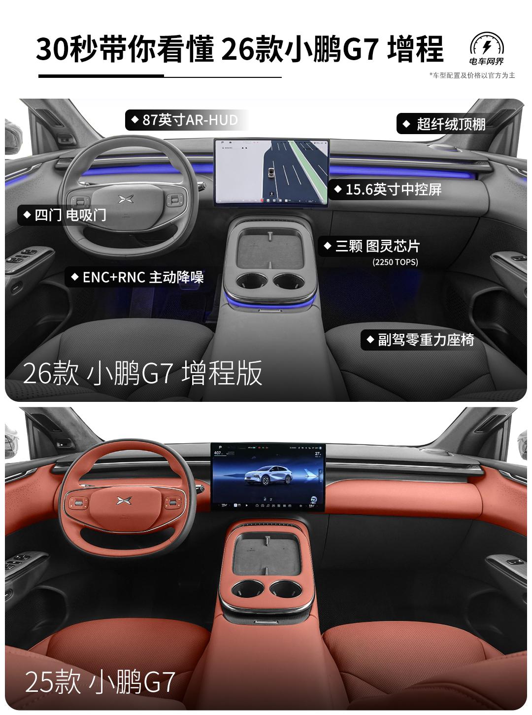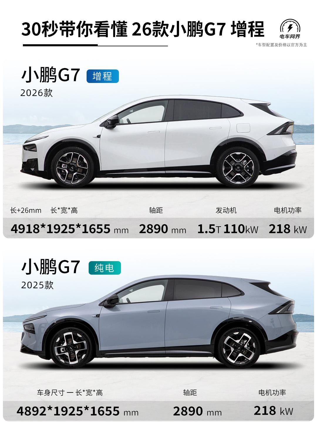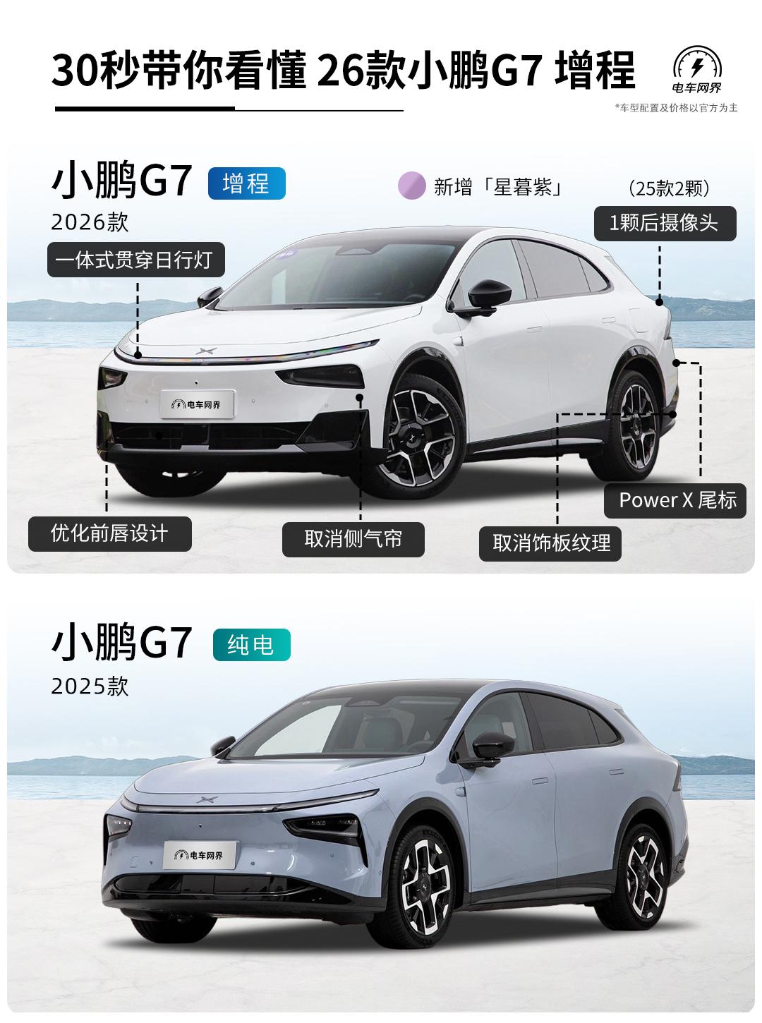 2026款小鹏G7增程版来了,这次最大的变化就是多了个增程版,从此纯电、增程任你选。其它地方也悄悄升级了。 具体变了啥?主要有以下几点: 核心是这套增程系统:用了一台1.5T发动机(110kW)加上后置电机(218kW)来驱动。平时用电,长途用油,没有续航焦虑了。 续航能力拉满:电池55.8度,纯电续航430公里(CLTC)。要是油电一起用,综合续航能干到1704公里,SUV里独一份。 架构/快充:G7增程也上了800V高压平台和5C超快充,充电速度有保障。 外观上:新加了“星暮紫”配色,升级了一体式贯穿大灯,把原来两边的侧气帘取消了,前唇饰板也进行了调整。增程版比现在的纯电版长了26毫米。 车尾细节精简:尾灯下面的两颗摄变成了一颗,黑色饰板上的纹理也取消了,整体更光滑 内饰部分:增程版专门给副驾配了零重力座椅,全系标配了ENC+RNC的主动降噪,升级了四门电吸们,比老款更舒适了【来自懂车帝车友圈】