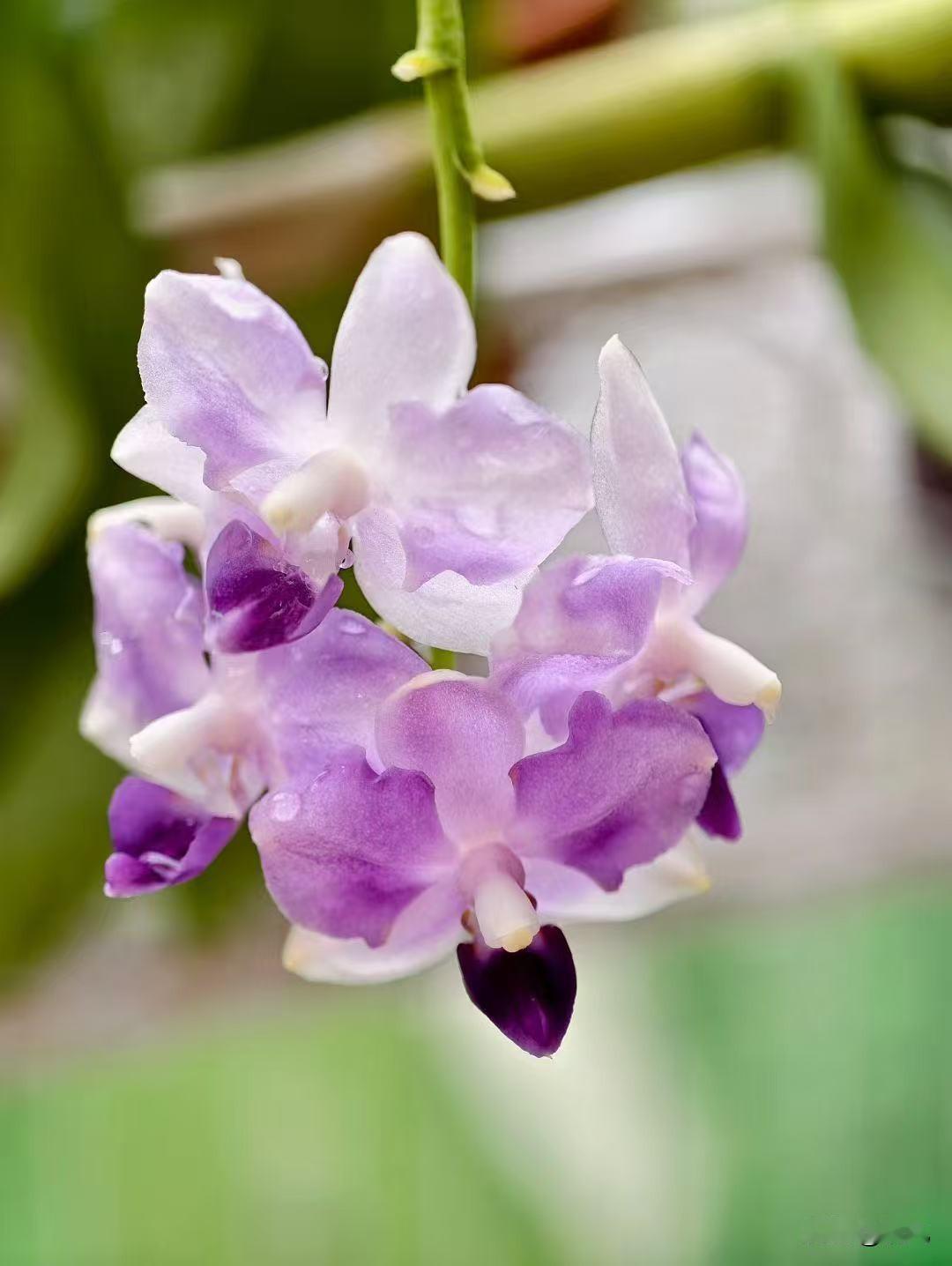 午后在花房撞见这簇风兰时,心一下子就软了。 它不像蝴蝶兰那般张扬,细细的绿藤悬着,紫白相间的花瓣凑成一团,像撒了糖霜的紫葡萄球,又似小姑娘扎的碎花绒球,嫩生生的。 花瓣薄得像蝉翼,浅紫晕开的地方透着光,深紫的花芯却又沉得很,像蘸了浓墨的笔尖轻轻一点。 风一吹,花簇晃悠悠的,半点不娇气,反倒带着股灵动的甜意。 凑近闻,是淡淡的清冽花香,不腻人,只觉得连周遭的空气都温柔了。 原来最动人的美好,往往藏在这些不惹眼的小角落呀。