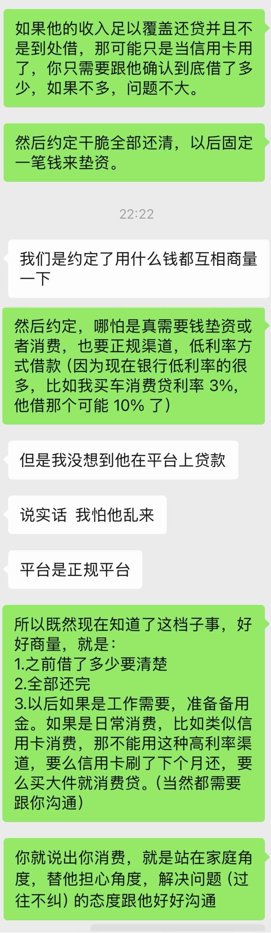 我就知道,许久不联系的朋友,一联系必定家庭问题了。说老公断断续续借了还了还了借网商贷,问我咋办。简单分析了一下只是网商贷,最大问题是利率太高了,日常消费犯不着用,工作需要垫资那就应该准备一笔资金专用而不是网商贷。当然夫妻双方最重要的还是,坦诚沟通,避免隔阂猜忌。PS:可见我家庭地位还是高,我买(亏)哪只股票从来不跟我老婆商量。