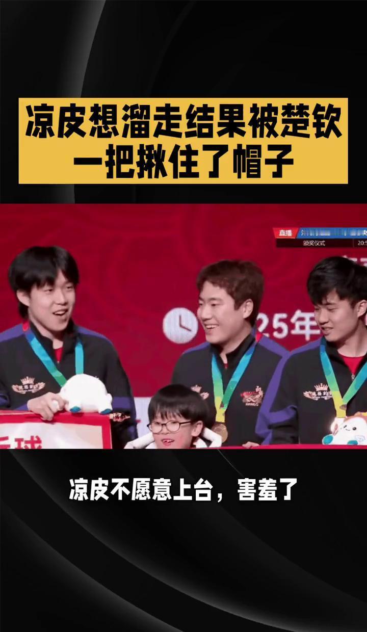 别信一个想逃跑的运动员。 他捂着脸想从台侧溜走。 王楚钦一把就揪住了那顶卫衣帽子,像拎住一只企图越狱的猫。 下一秒,他和队友一左一右,直接把凉皮拔高,双脚离地。 全场爆笑。 他还在空中蹬了两下,最后自己也笑了。 你看,最硬的球台边,容得下最软的羞怯。 最好的队友,不是陪你赢,是看见你想逃时,笑着把你举起来,让你无处可躲。 那不是退缩,是另一种前进的姿势。