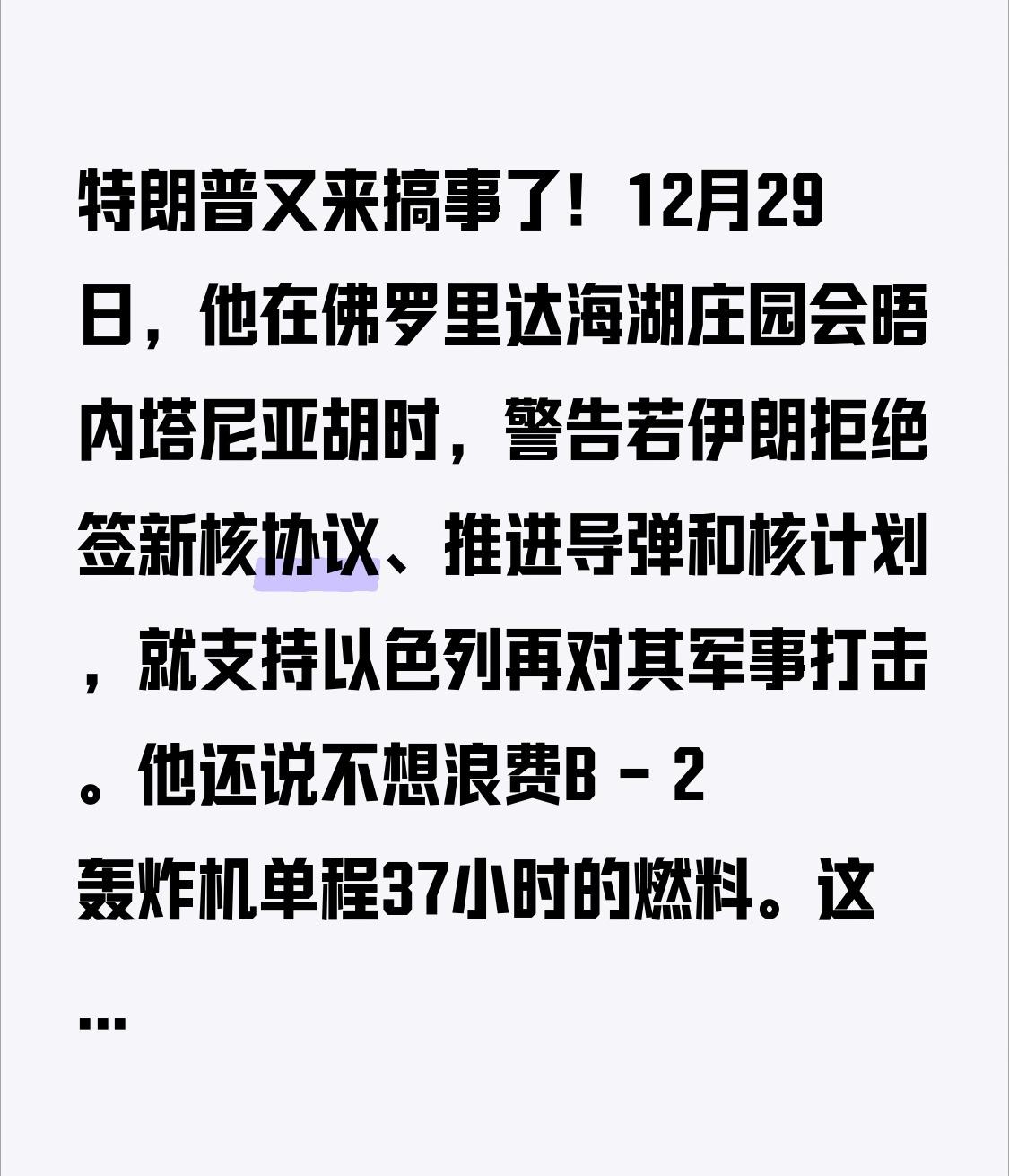 特朗普又来搞事了!12月29日,他在佛罗里达海湖庄园会晤内塔尼亚胡时,警告若伊朗拒绝签新核协议、推进导弹和核计划,就支持以色列再对其军事打击。他还说不想浪费B - 2轰炸机单程37小时的燃料。这话说得,好像多心疼燃料似的。 今年6月美以就轰炸过伊朗核设施,虽说停火了,但外交解决冲突希望渺茫。以色列觉得伊朗导弹和核计划威胁国家安全,伊朗也没闲着在重建导弹库。特朗普这一警告,估计又要让中东局势紧张起来,不知道后续会怎么发展,真是让人捏把汗。