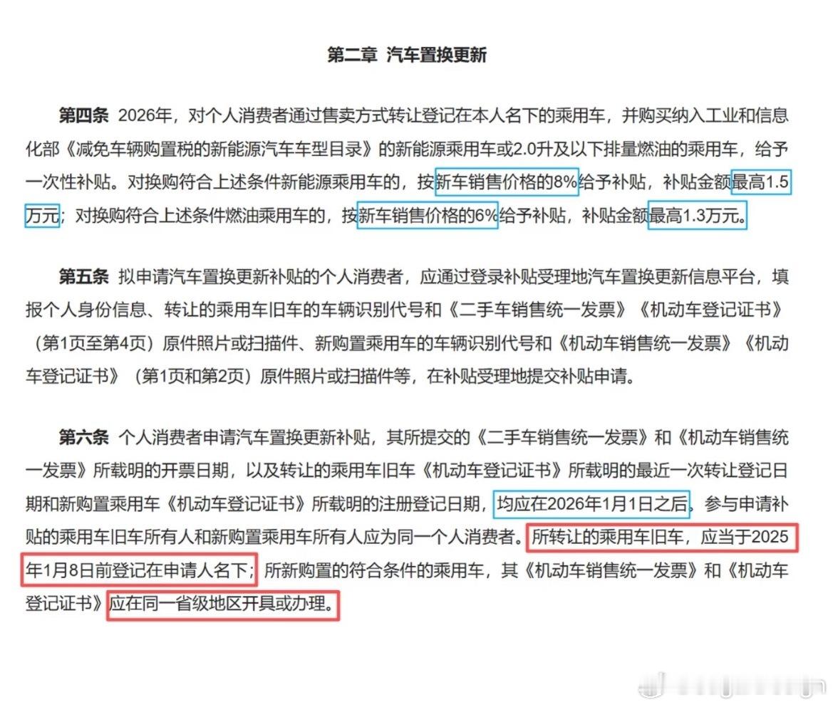 置换报废补贴细则来了报废车辆必须是注册登记在2013年6月30前的燃油车,2015年6月30日前的柴油或其他燃料车,2019年12月31日前的新能源车。置换和报废车辆都必须在2025年1月8日前在本人名下前几个月买了旧车打算囤着等补贴买新车的可能天塌了,这时间线竟然没有往后延2026年的以旧换新政策在1月1日开始执行。所以原本今天打算提新能源车,又名下有符合以旧换新政策车型的小伙伴,可能得权衡一下到底是购置税减半划得来,还是补贴划得来了。大脑飞速运转一下我算了一下,30万的好像还是以旧换新划得来?赶紧让你的销售算算吧,还有几个小时可以考虑
