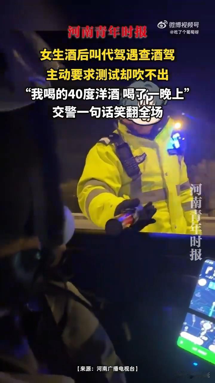 我真喝酒了!40℃的洋酒喝了一晚上! 交警一句话让小姐姐泪奔了!你喝假酒了呗! 小姐姐喝完酒叫代驾,中途遇到交警查酒驾,突发奇想的想吹一下看看酒精含量,结果吹不出来! 她追问交警,为什么吹不出来,我真喝酒了,结果交警说“你喝的假酒呗”!这一句话让小姐姐有点意难平啊!