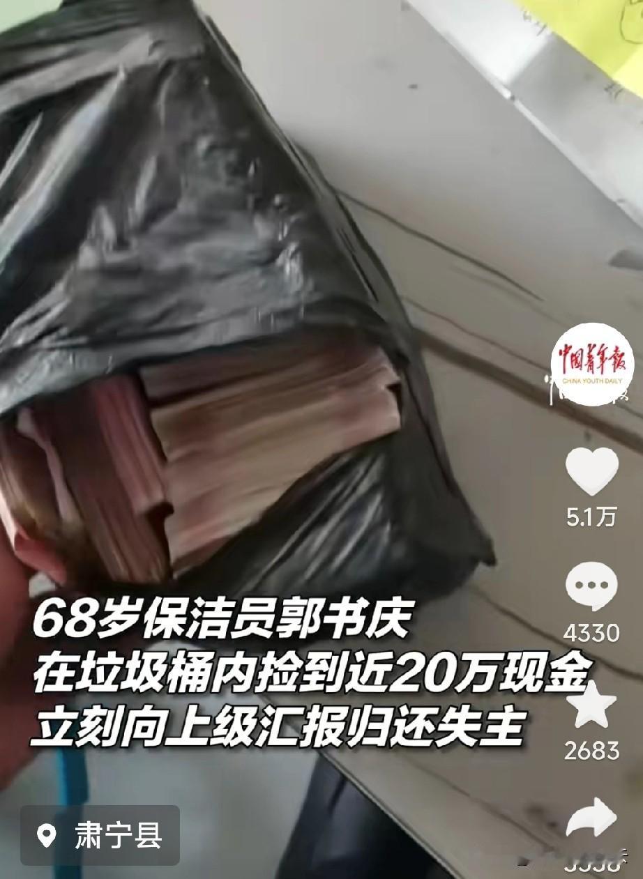 必须点赞!河北肃宁的郭书庆大爷是个保洁员,早上他在收拾垃圾的时候,看到一个大灯泡,本来想拿回家用。没想到打开灯泡,里面是满满一大袋子钱。 郭大爷一惊,但他没有犹豫,赶紧把钱装好,给村支书打了个电话,说了这个事。大爷说当时就想着失主丢了这么多钱得多着急,赶紧还给人家。咱虽然人穷志不穷。 有网友说,说实话面对这么一笔巨款,如果是我,都不一定能做到大爷这样,大爷好样的! 给郭大爷点赞!也希望给郭大爷些奖励,看大爷生活的也挺不容易的![赞][赞][赞]