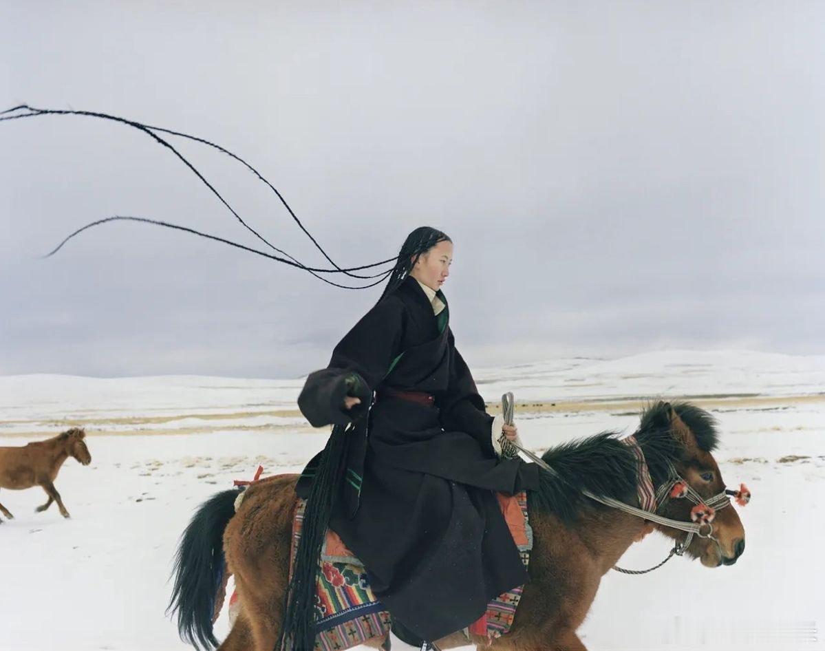 Kin Chan Coedel 为《Vogue》拍摄的西藏骑手: 高原逆光下,骑手裹着厚重的藏袍,胯下的藏马矮小却结实,鬃毛在风中扬起。整个画面像一幅移动的油彩——一半是尘土,一半是云影。热点观点海外新鲜事