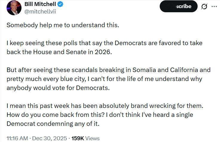 比尔·米切尔: 有人帮我理解一下这个情况吗? 我一直看到那些民调,说民主党在2026年有可能重新夺回众议院和参议院。 但是,在看到索马里、加利福尼亚以及几乎所有蓝色城市接连爆出的丑闻之后,我真搞不明白为什么还有人会投票给民主党。 我是说,上周对他们来说简直是彻底的品牌毁灭啊。他们怎么可能从中翻身?我还没听到一个民主党人对这些事情表示过谴责。