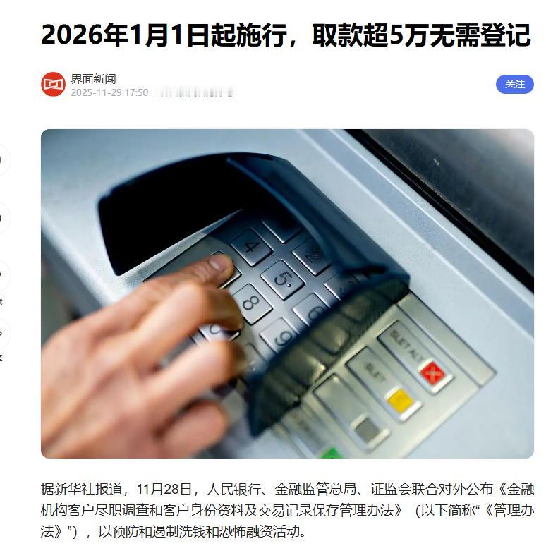 好消息!钱存银行的人要乐开花了,从2026年1月1日起,不管你存还是取,只要个人存取现金≥5万元,不用再强制登记资金来源和用途,仅需完成身份核验即可办理。 这件事之所以值得大书特书,是因为在过去很长一段时间里,去柜台办现金业务简直成了一场“心理博弈”。 咱们普通人存钱取钱,明明是自己辛辛苦苦挣来的工资、养老金,或者是做小本生意攒下的流水,可一旦数额稍微大点,隔着柜台那层玻璃,就要面对一连串的“灵魂拷问”。 钱是从哪来的?取出来要干什么?具体要给谁花?这一套流程走下来,不知道的还以为是在做笔录。 如果是年轻人还能应付两句,要是换了上了年纪的大爷大妈,耳朵背、眼睛花,再让他们填一堆密密麻麻的表格,那真是一折腾就是半天,心里既着急又委屈,感觉自己的钱自己还做不了主了。 其实,这种繁琐的流程早就成了银行和储户之间的一道“堵点”。咱们现在的支付习惯早就变了,平时买菜、吃饭、坐车,掏出手机扫一扫就能解决,真正用到现金的地方越来越少。 根据银行系统内部的统计,现在绝大多数的交易都是在手机上完成的,真正还要跑到网点柜台去存取大额现金的业务,在所有现金交易里也就是个零头,占比大概只有2%左右。 可别小看这仅仅2%的业务量,因为以前那套必须要人工问询、手工填表的笨办法,硬生生地占用了银行基层网点将近40%的时间和精力。 这就造成了一个非常尴尬的局面:柜台里面的工作人员累得够呛,还得顶着压力去问客户隐私;柜台外面的客户排着长队,心里满是怨气。 更有甚者,为了怕担责任,有些地方的网点甚至自己给自己“加戏”,明明规定是5万元以上才要核查,他们硬是把门槛降到了1万元或者2万元。 只要你拿现金来,不管多少都得盘问一番,这种层层加码的做法,最后受罪的还是咱们普通老百姓。 所以说,这次定在2026年实施的新规,不仅仅是一个简单的流程简化,更是对过去那种不合理管理方式的一次彻底“拆除”。 这对于那些离不开现金的人群来说,绝对是卸下了一个大包袱。 从2026年开始,咱们去银行少填的那张表、少费的那番口舌,背后其实是金融服务理念的一次回归。 这标志着银行不再把每一个储户默认当成“可疑分子”来防备,而是真正开始尊重大家对自己合法财产的支配权。 只要你的钱来路正当,用途也是合法的,那么那些针对洗钱和犯罪的“重点核查”就和你毫无关系,你只管享受便捷的服务就好。 对于咱们普通人来说,以后唯一需要注意的,就是保护好自己的身份证件和账户信息,别为了帮别人一点小忙或者贪点小利,把自己的账户借给别人用,更不要为了躲避监管去搞什么资金拆分。 毕竟系统虽然不问话,但它什么都“看”得见。 这次调整,看起来是少了一道手续,实际上是把方便还给了群众,把复杂留给了数据系统。 金融服务不再是冷冰冰的管控和防范,而是重新回到了“为人服务”的本质上来。这种既有温度又有速度的变化,才是咱们老百姓真正盼望的。 不过随着现金存取变得越来越方便,在移动支付如此发达的今天,你觉得自己以后使用现金的机会是会变多还是变少呢? 欢迎到评论区讨论 本文首发于今日头条 信息来源:界面新闻