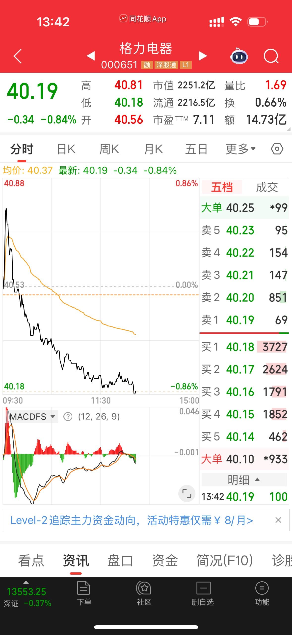 格力又要跌回40元以下吗? 这是一点儿都没受家电国补重启的影响啊! 今天的格力开盘冲高,但随即开始下跌,幅度较近期比较大。是有啥利空吗?还是利好兑现是利空? 不过,丝毫不影响加仓格力的步伐。如果跌到40元以下,就又是加仓区域了。