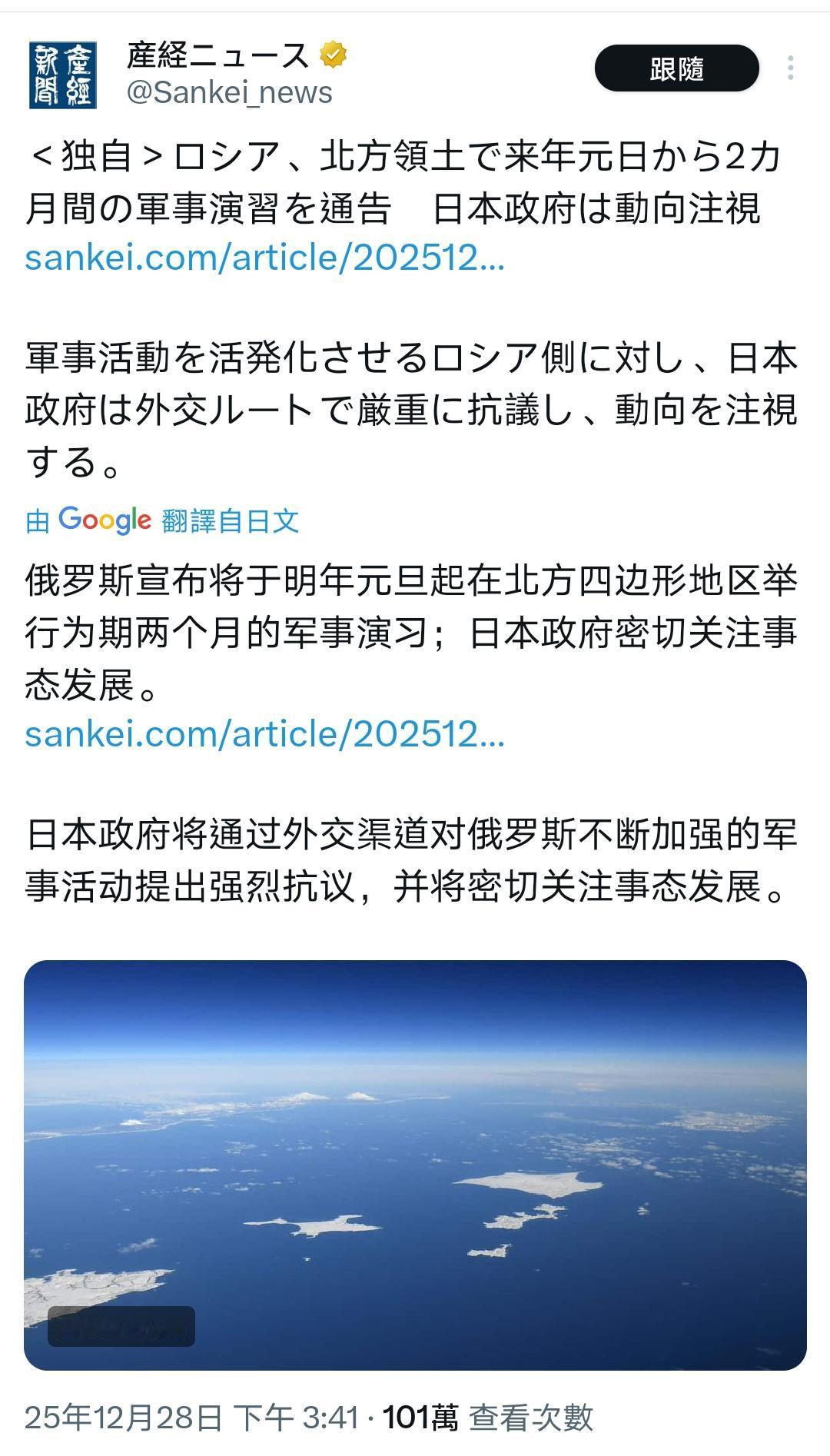 俄式“爽文”的巅峰操作:不争一岛,而围一州 俄式“爽文”的本质:制造意外。 当全世界都以为,新年军演的舞台依旧是南千岛群岛(日称“北方四岛”)时,莫斯科却把剧本直接撕了。反派(日本)的抗议声刚落,俄军的演习区域,已从争议岛屿,直接推到了北海道的家门口。 五块刺眼的禁航区,如锁链悬于日本本土。这不是“争议岛屿”的较量,而是“本土威慑”的终极推演。俄方用最冷静的地图,打最诛心的心理战:争议领土?我已视为囊中之物。真正的剑锋,抵在你最怕被触碰的咽喉。 连推文ID都透着毫不掩饰的嘲讽。这已超出军事演练,是一场精密的认知作战。 这一手,将“极限施压”玩到了新高度。它让人不禁想起那段尘封的历史:1945年,苏联红军曾登陆北海道,握有留下的筹码。虽然后来撤离,但今日这番“兵临城下”的演习,仿佛在无声叩问:当年的“可惜”,是否会成为未来某种可能性的遥远注脚? 俄式“爽文”目的向来清晰,不免带着改写游戏规则的傲慢,这次,却附带了快意打脸的赠品。 就问你,爽不爽! Source: X