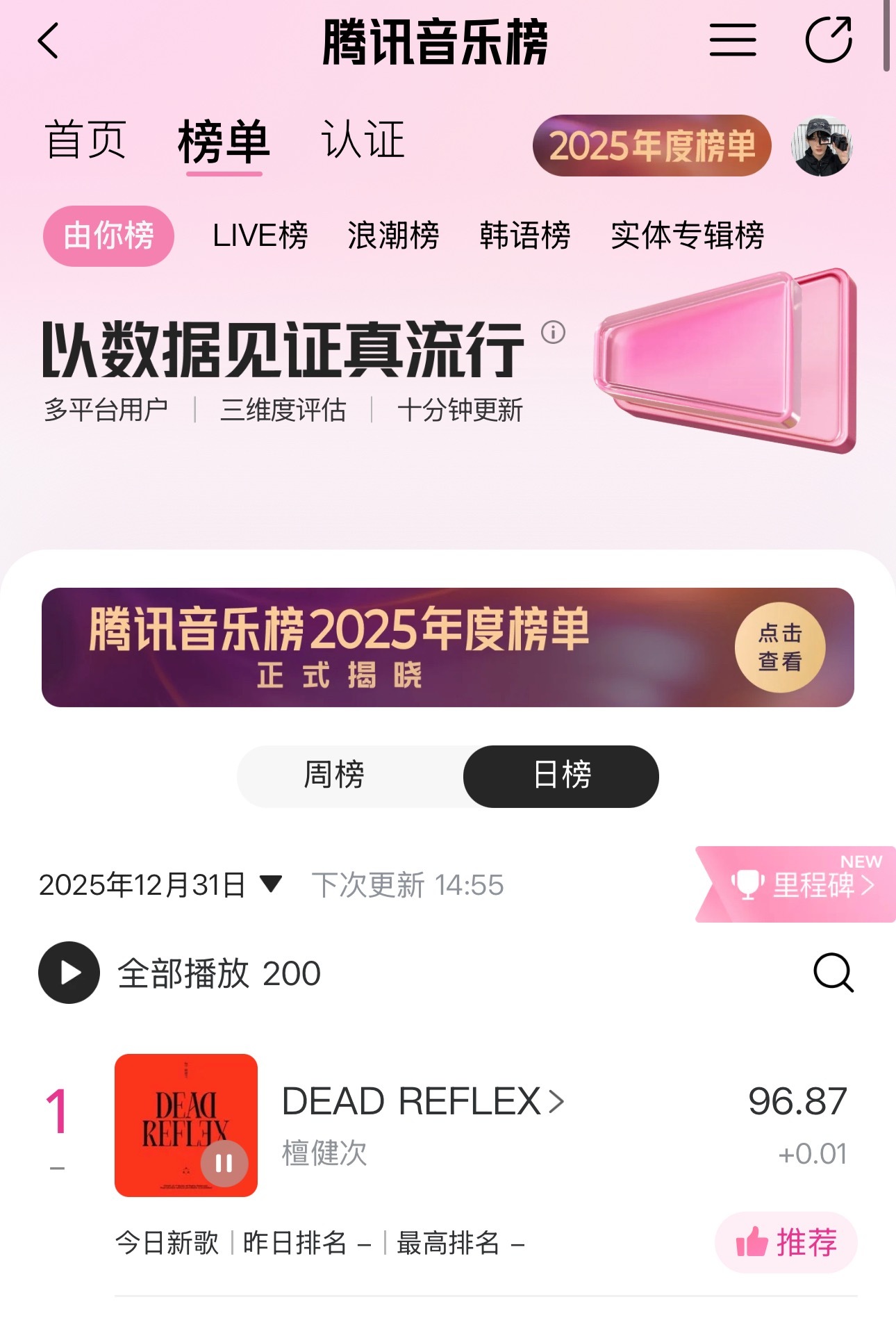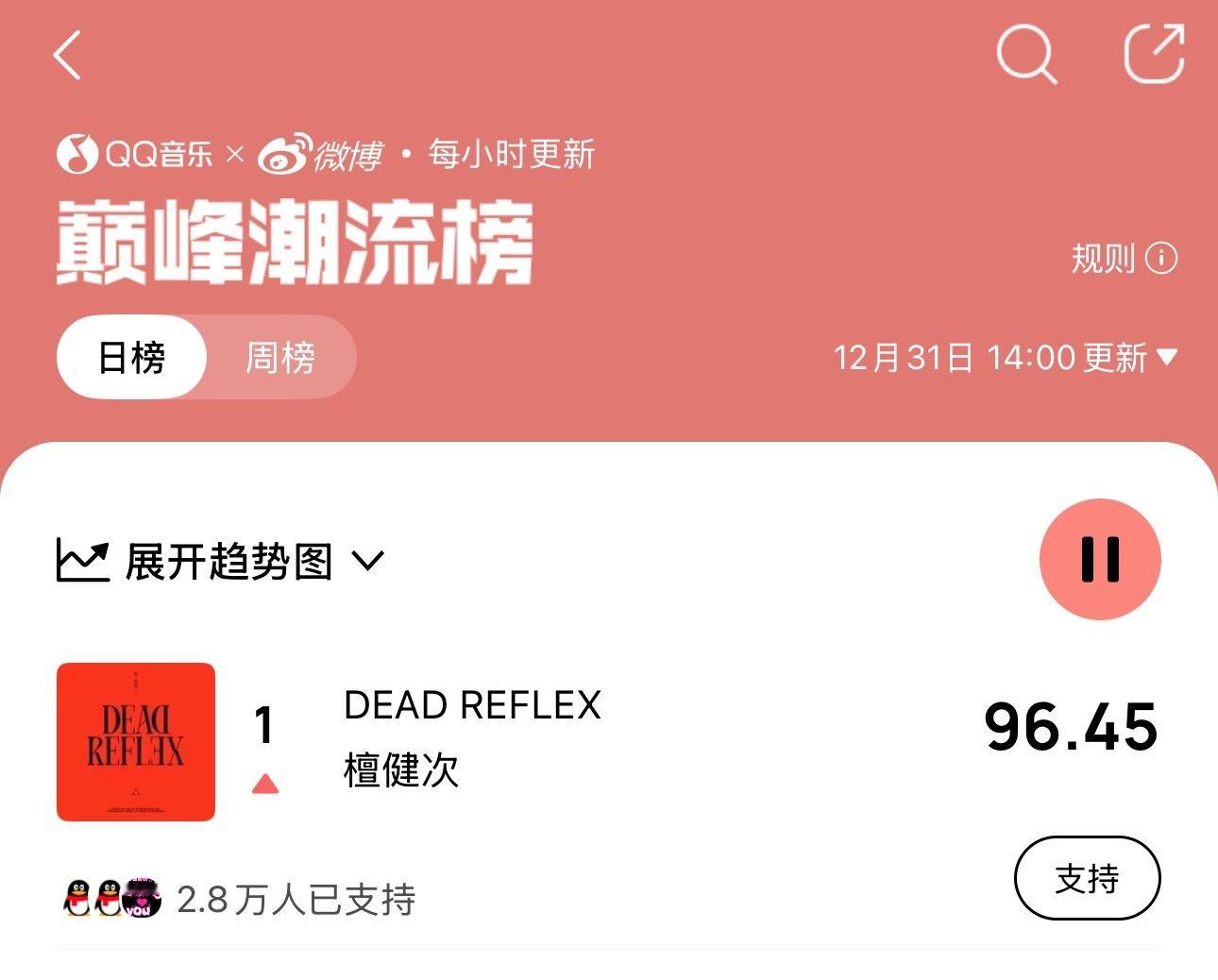 目前由你榜周榜第四,日榜第一巅峰潮流榜第一继续继续!能不能让由你榜周榜《DEAD REFLEX》和《PROOF》挨着!