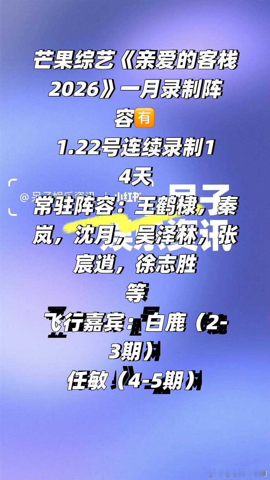 综艺《亲爱的客栈2026》1.22连续录14天常驻阵容:王鹤棣,秦岚沈月,吴泽林,张宸逍,徐志胜飞行嘉宾:白鹿(2-3期)任敏(4-5期)亲爱的客栈‖