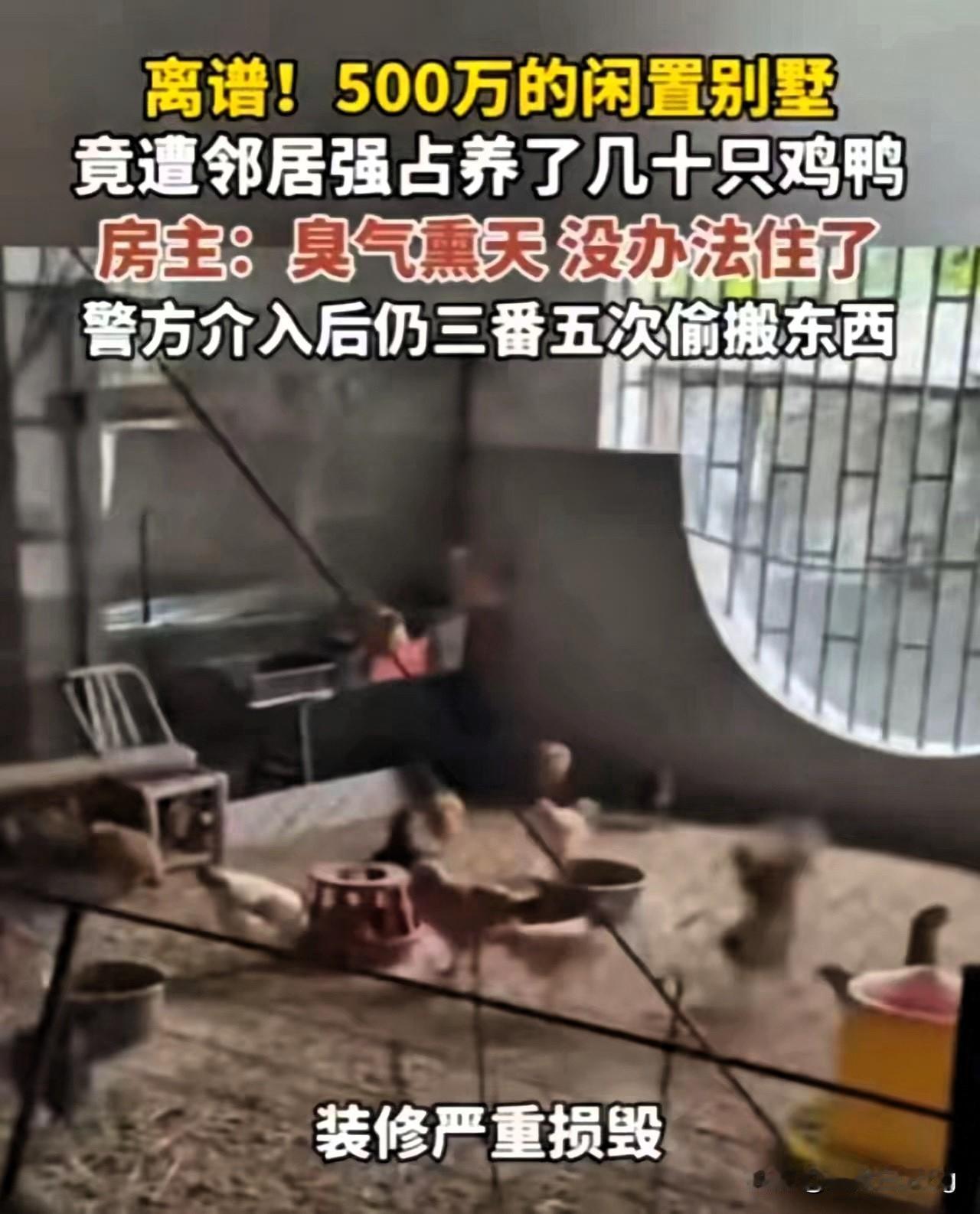 “脸都不要了!”福建大哥花500万建的别墅闲置着,冬至回老家祭祖,一进门就被刺鼻臭味熏懵,地下室居然藏着四五十只鸡鸭,满地鸡粪把装修毁得不成样子! 更气人的是,邻居不仅撬锁占房,报警后还三番五次潜入转移东西,连句诚恳的道歉都没有。这哪是占小便宜,分明是把别人的私有财产当自家地盘,连最基本的边界感和尊重都没有。 别觉得闲置房就活该被糟蹋,民法典早有规定,无权占用他人不动产要担责,之前就有类似案例判了赔偿。尊重别人的财产,其实也是在护自己的体面。 换作是你,遇到这种得寸进尺的邻居,会坚决维权到底还是勉强和解?