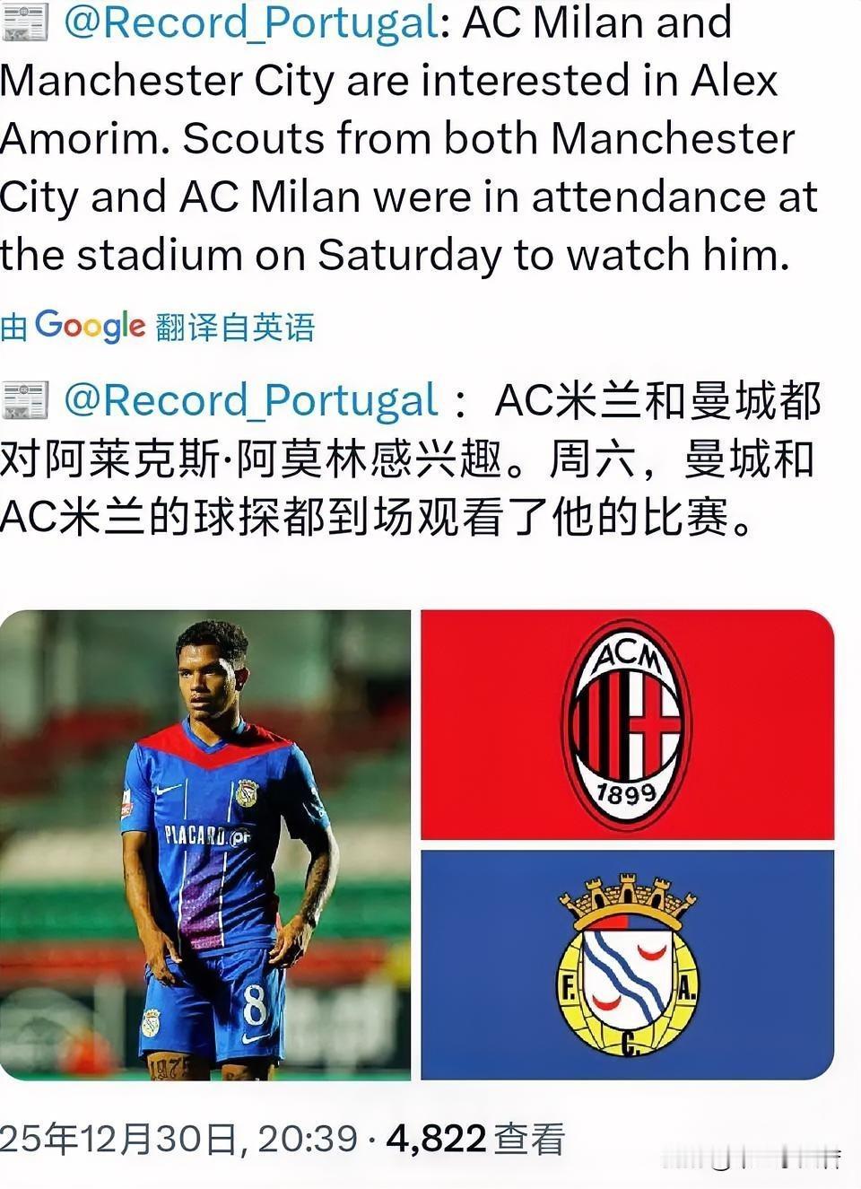 阿莫林!米兰俱乐部对阿贾克斯的阿莫林充满兴趣,球队第N次派出球探考察球员,同时阿莫林也是英超曼城俱乐部的目标球员,他们的球探也一直在跟踪考察阿莫林的情况。 这个孩子的名字不好,搜到的大部分信息都是曼联那个不幸的主教练,看了大部分标题,曼联那个阿莫林快成战犯了,全世界各种语言版本讨伐,关于阿贾克斯这个阿莫林的信息太少了,只有他进入阿贾克斯一线队训练的消息,我理解为这是一个年轻球员,米兰是要去刮彩票。 我很认真的查了阿贾克斯12月的比赛,截止到2025年12月21日,奈梅亨vs阿贾克斯首发阵容与替补阵容就没有这个球员,当然也可能我老眼昏花,总之这个孩子信息太少了,眼睛都疼了,也没有多少关于他的消息,到是有老哥分享了一个特别模糊的集锦,感觉是青年队比赛的视频,球场质量非常差,这个孩子过人与速度看着还挺令人激动的,但身材偏瘦,感觉对抗能力一般。