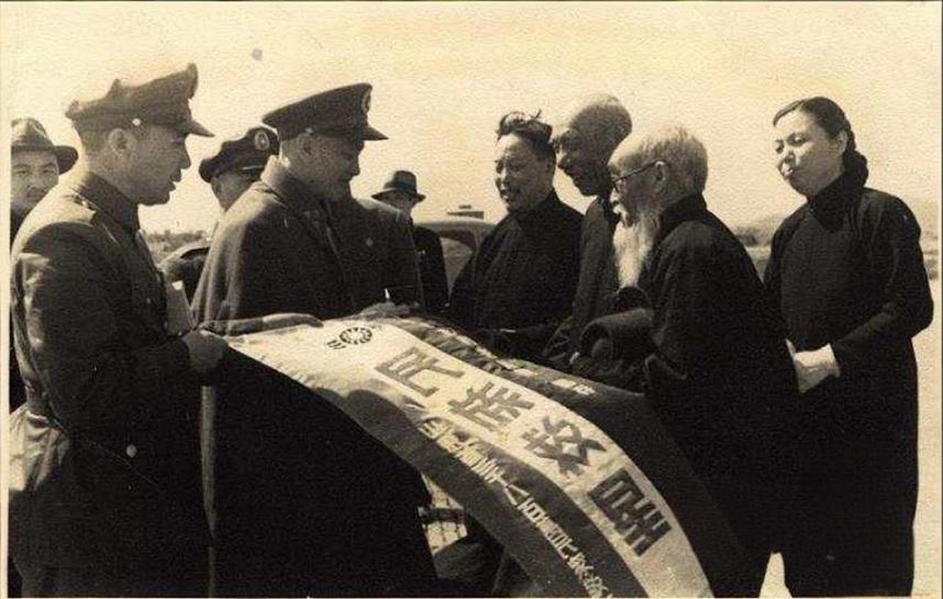 1947年5月3日,山东济南机场,蒋介石(前排左二)和王耀武(前排左一)共同接见当地国民党官员、士绅和群众代表。一面锦旗展开,上书“民族救星”字样,右侧几位长袍马褂的老人(当地名流)正与蒋介石握手,现场气氛庄重而热烈。