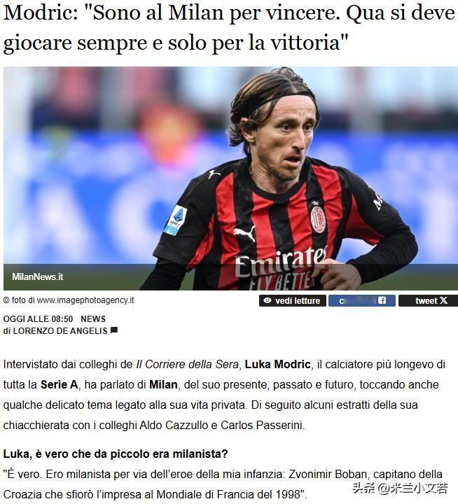 为胜利而战!莫德里奇接受采访表示我来米兰俱乐部的目的是赢得比赛胜利,在米兰大家必须明确目标,我们应当为胜利而战。 莫德里奇与拉比奥特还有帕夫洛维奇都是那种为胜利而生的球员,无论对手是谁,无论场上是啥局面,他们都是那个始终想战斗的球员,他们想去获得比赛的胜利,前几天有报道说皇家马德里俱乐部更衣室失衡就是因为莫德里奇的离开,球员失去了前进的动力,之前球员已经习惯了有莫德里奇带领,习惯了有莫德里奇指引,当莫德里奇离开后,球员突突然就失去了方向,很幸运莫德里奇能来米兰,看上赛季那个情况,如果不是莫德里奇与阿莱格里来米兰,估计米兰又要天黑了。 如果马尔蒂尼博班的规划不被打断,博班不被赶走,估计魔笛能早来米兰,如果只是说如果,莫德里奇可以早三年加盟米兰,那米兰将是什么局面,只能是如果,十几年终于看到的复兴希望,被红鸟集团给毁了。贝卢斯科尼主席看到这样的局面就不难过吗?为啥还不把卡迪纳莱带走。