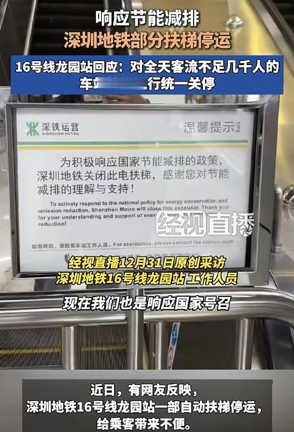 深圳地铁16号线有网友反映,有一部自动扶手电梯被关停,给很多出行的市民带来不便。地铁官方回应,为了响应国家的节能减排号召,他们对于这条线一天不足几千人的情况对于部分扶手电梯进行关停,因为在地铁内也有垂直电梯,ab端也各开设的电梯只是停了一部电梯而已。有网友建议在节假日高峰期可以把电梯重新启用,工作人员表示会把情况反映给上级。