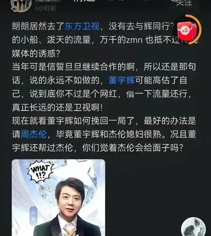 郎朗没出现,4000万人白等 去年跨年他和董宇辉同框,钢琴声一响,直播间冲顶热搜。很多人以为从此固定搭档,结果今年只剩宇辉一人。 我翻了东方卫视节目单,郎朗名字挂在巴黎巡演,那是中法建交60周年官方场,提前十八个月就签好。顶级演奏家的日程像高铁,改一趟线牵动全年。 再看数据,带货直播间里音乐只占7%,多数当背景。让郎朗坐在锅碗瓢盆旁弹肖邦,他自己别扭,观众也出戏。央视索福瑞显示,卫视跨年平均收视2.89%,覆盖一亿家庭,这个舞台更适合他的国际身份。 艺术家不靠卖货吃饭。中国音协调研,85%的演奏家收入来自专业演出,商业合作只占一成五。董宇辉这边也没闲着,1月5日请来中央音乐学院教授,换种方式聊音乐。 一个去巴黎弹给世界听,一个在直播间陪我们买年货,两条路都对。真正难受的是把谁绑在谁身边。下次再遇到缺席,先查查日程表,也许他正在地球另一端,让琴声代替说话。