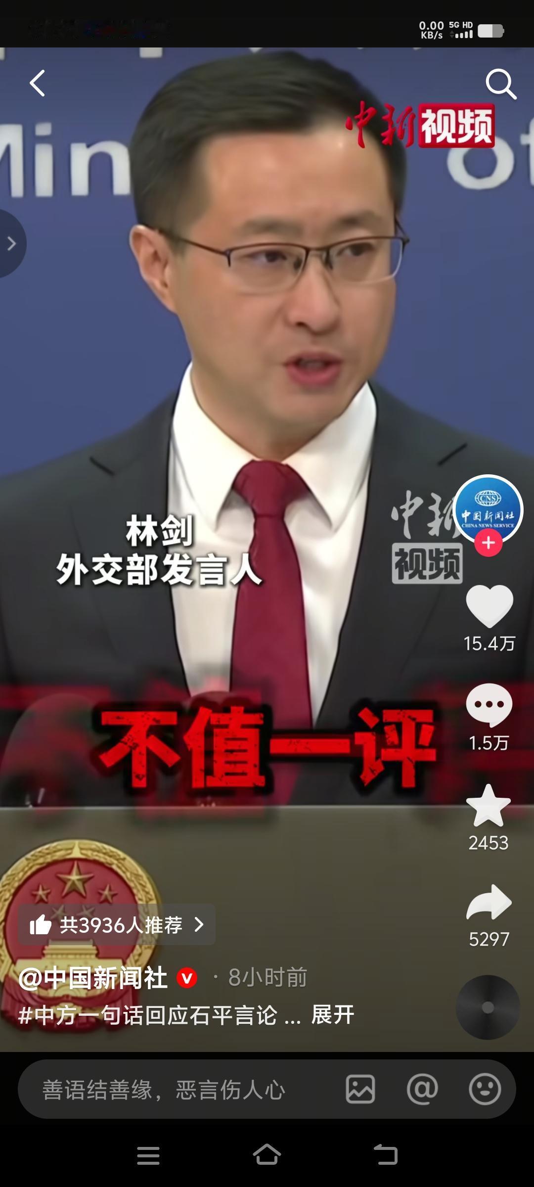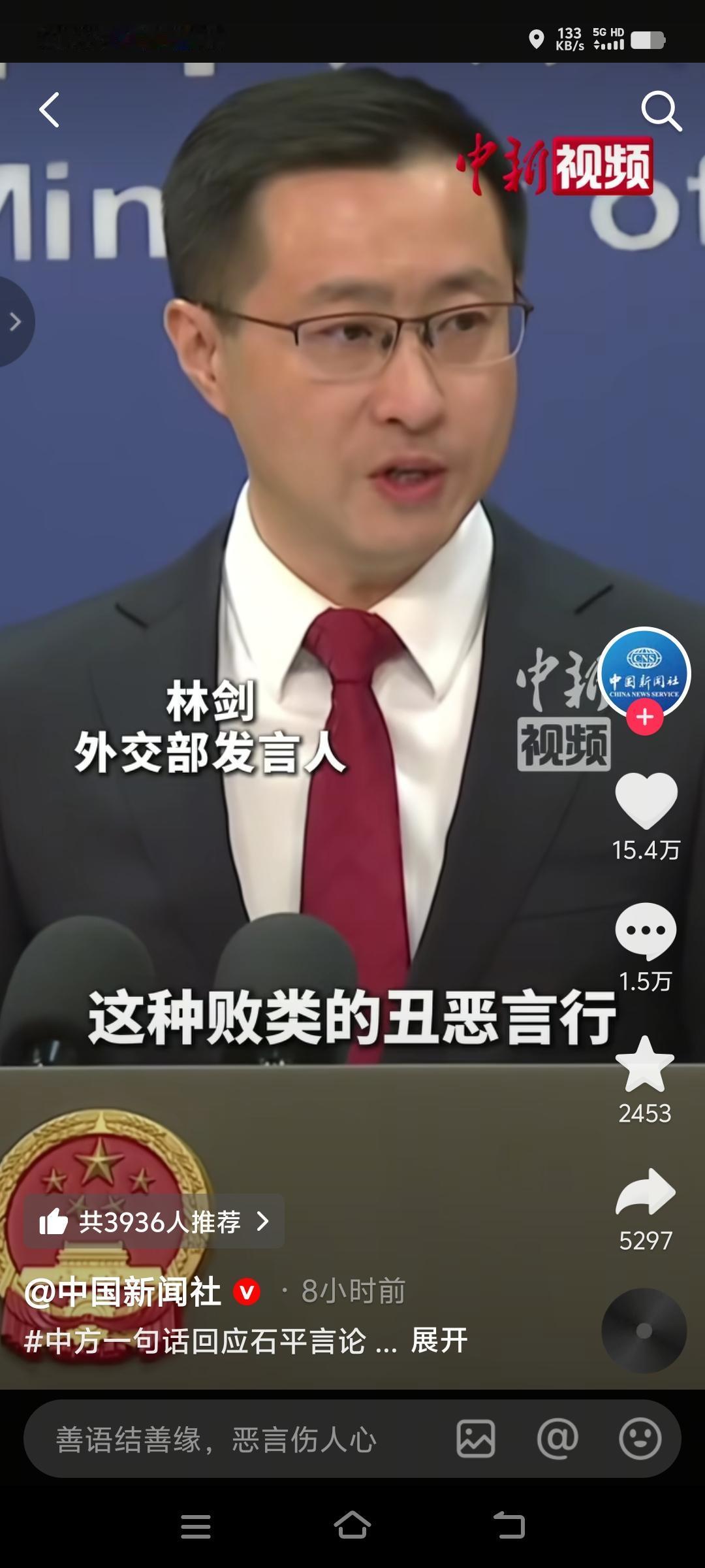 对不怀好意的挑衅, 就必须霸气的回怼。 日本记者故意把石平这个汉奸提出来,一个汉奸有什么好去在意的,他估计也没想到我们会在公开场合骂败类这样的话,被狠狠的打脸,活该。 林剑的一句话:这种败类的丑恶言行,不值一评! 这才是他们能听懂的话。 大家听听,你就说带不带劲,林剑帅不帅。 我觉得骂的太文明了,一定是外交官的身份限制了他的发挥,这一骂,骂出了十四亿中华儿女的共同心声!真的给力! 网友评论说:这是我看到最牛逼的,最直接的外交辞令。 对石平这种败类,多说一句都是在污辱自己的智商,希望台湾人民行动起来,禁止败类踏入我中华国土,此时此刻,我跨年跨的更开心了!