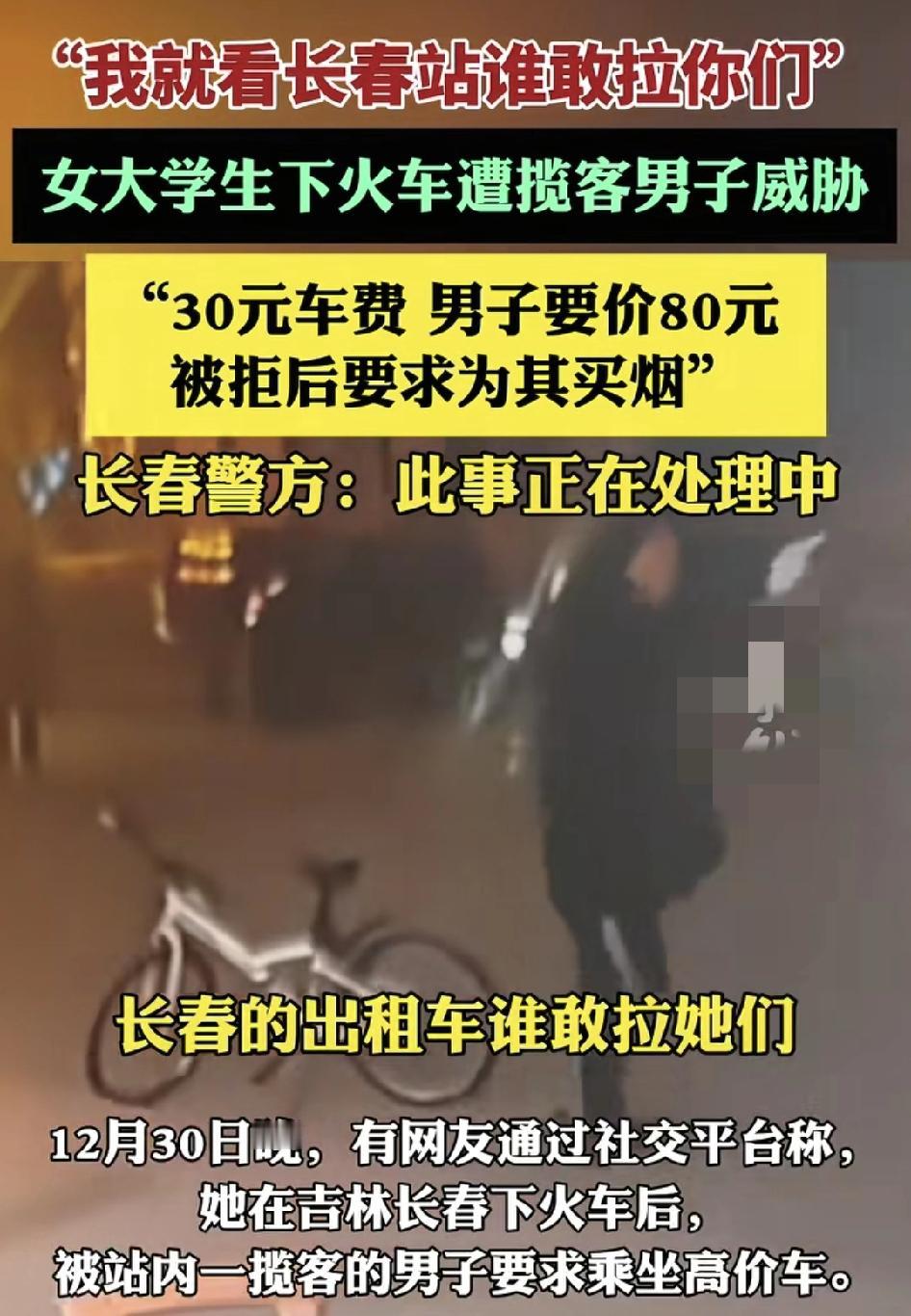 吉林长春火车站有几名女生称下火车之后准备搭乘出租车,一名出租车司机要价80元一位,觉得价格不合理就拒绝了,没想到司机在那里大声威胁,要求他们买烟,再次被拒绝之后,还声称这个时候这谁敢拉,他们就给羊了,女生说,随后请乘坐其他车辆离开的时候,价格只需要30。