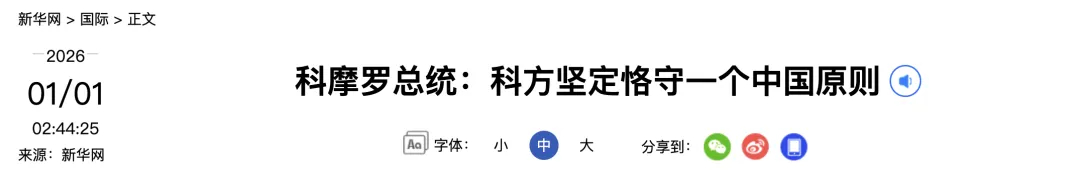 #柬埔寨最新涉华表态#【柬埔寨、科摩罗最新涉华表态】 柬埔寨外交与国际合作部发言人2025年12月31日晚发表声明,重申#柬埔寨坚定恪守一个中国原则# ,承认中华人民共和国政府是代表全中国的唯一合法政府,台湾是中国领土不可分割的一部分。声明说,台湾问题是中国的内政,柬埔寨支持中国为实现国家统一所作努力,反对任何形式的“台独”。科摩罗总统:科方坚定恪守一个中国原则莫罗尼消息:科摩罗总统阿扎利2025年12月30日在科首都莫罗尼举行的庆祝中国和科摩罗建交50周年招待会上强调,科方坚定恪守一个中国原则,支持中国统一大业。阿扎利向中国驻科摩罗大使黄峥赠送了科中建交50周年纪念牌,并在致辞中盛赞科中两国友谊树立了国际关系典范,感谢中国长期以来对科的支持帮助。黄峥表示,自中科建交以来,两国始终相互坚定支持、平等相待、团结互助。中方将落实好两国元首达成的重要共识,不断延续构建中科命运共同体的“山海情”。招待会由中国驻科摩罗大使馆和科摩罗政府总秘书处共同举办。当日,中科各界200余名嘉宾出席招待会,与会嘉宾还参观了中科建交50周年图片展。(综合央视新闻、新华网)