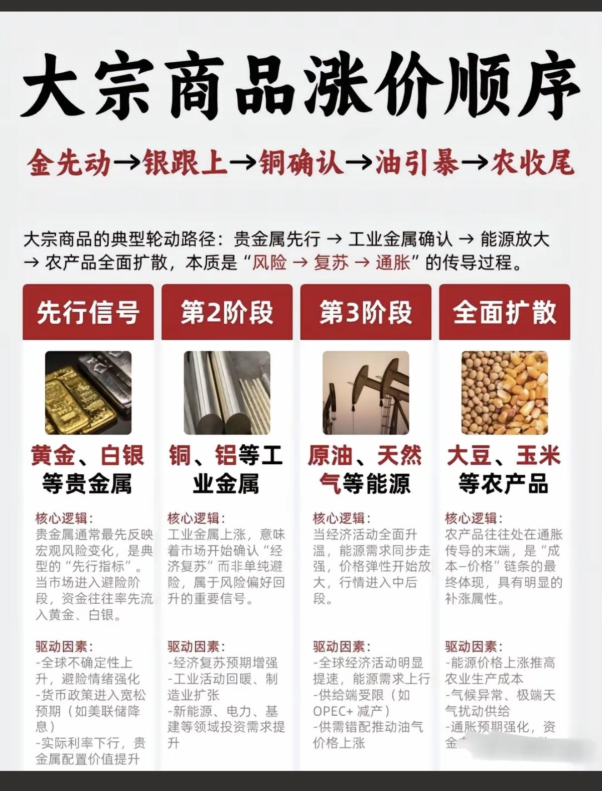 财富赛道顺序:大宗商品涨价! 金先动,银跟上,铜确认,油引爆,农收尾。现在到了