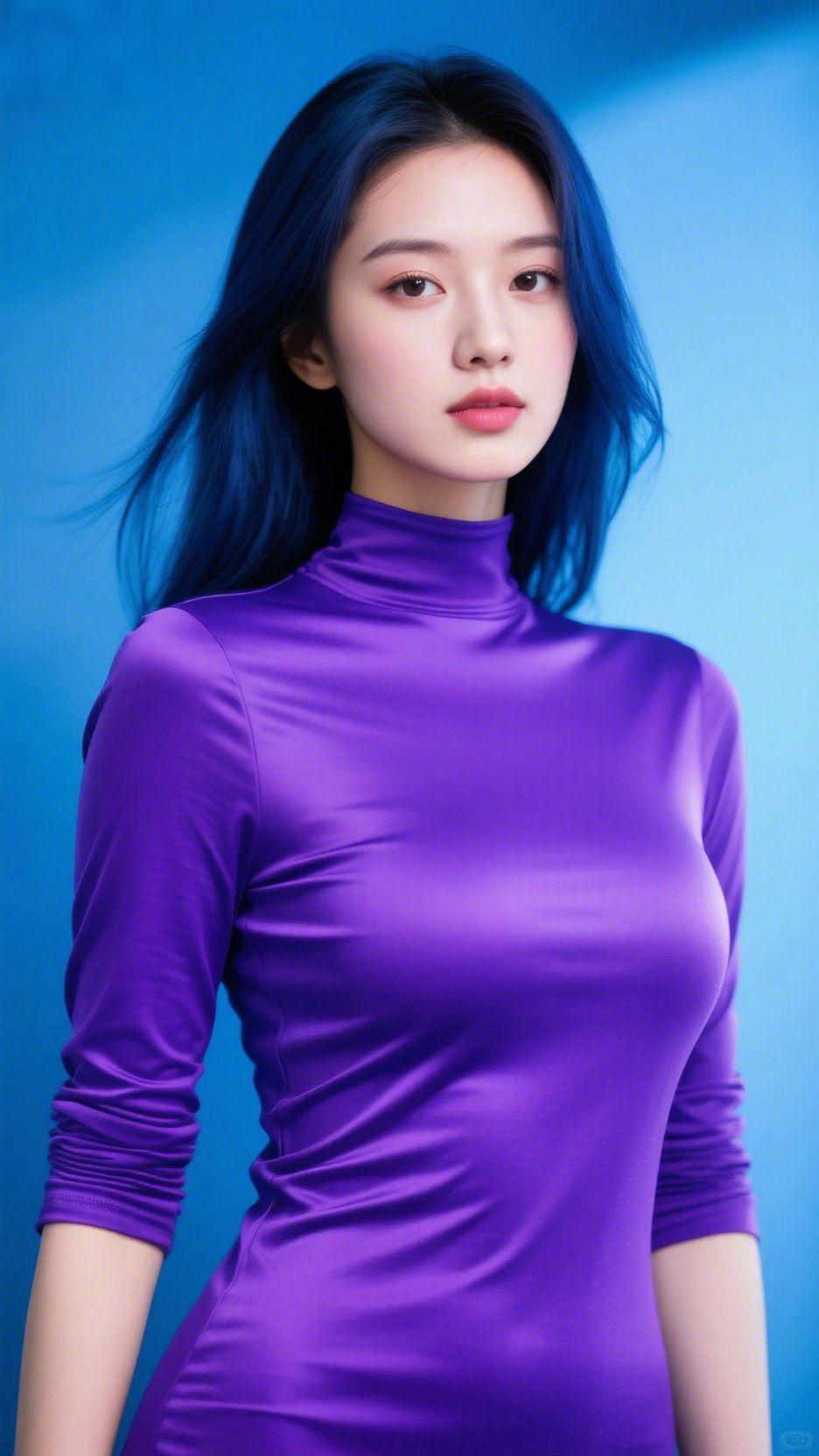 蓝紫相映成清景 钴蓝色的背景似揉碎的深海,漫出清透的凉。她的发丝晕着同调的蓝,像把暮夜的星子缠进发间,垂落时掠过肩头,与紫罗兰色的高领衫撞出极致的视觉张力。绸缎质地的紫衫泛着细腻光泽,在光影里缓缓流转,如紫玫瑰绽放在蓝调的画布上。 她抬眸的刹那,眸光澄澈如泉,眉峰间凝着几分清冷,却又在蓝与紫的交织里,漾出一抹孤而不寂的温柔。这抹色彩的碰撞,不是刻意的张扬,而是从气韵里透出来的惊艳。原来美从不是刻板的模样,而是当个性的色彩遇上独特的灵魂,便成了眼底挥之不去的风景,轻轻叩击着心底对美的向往。 人像美学 色彩碰撞