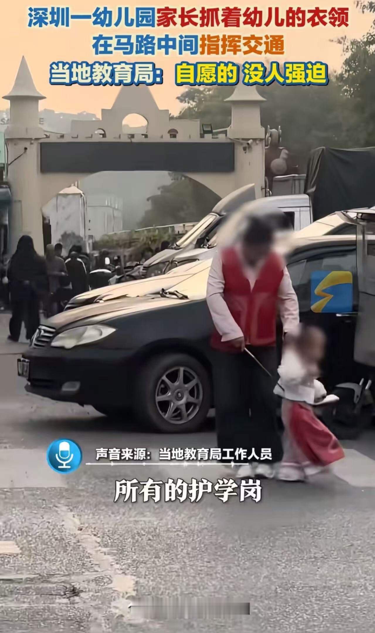 深圳,一幼儿园家长抓着幼儿的衣领,在马路中间指挥交通,被网友拍下发到网上质问:现