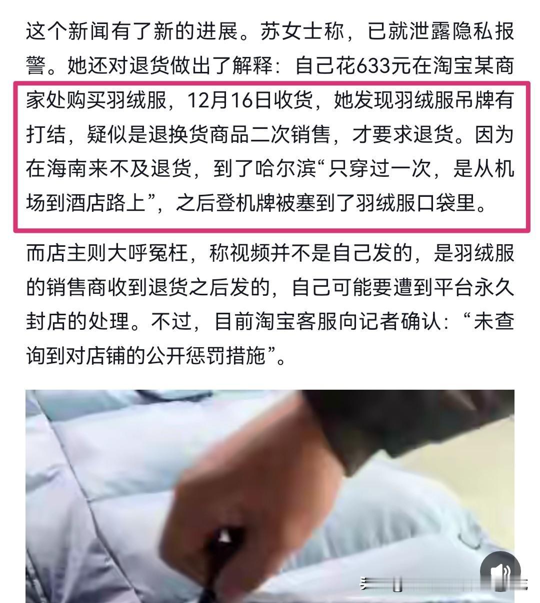 苏女士确实不是后悔了,而是害怕了,她最后悔的是退货前没掏兜清空,把机票落下了!如果厂家选择息事宁人,下一个苏女士还会出现,她们不是一个人,而是一个群体,只要吊牌还在,她们就会卡在最后一天退货退款。 苏女士的解释也很牵强,就是来不及退货,也就穿过一次,可是她却来得及从海南带到了哈尔滨,难道是怕行李箱没东西装了?明眼人都清楚,就是买回来准备白嫖去趟哈尔滨的,无论找什么样的理由都很难服众的。如果没有这张机票,商家只能自认倒霉,更多的商家也会遭遇此事。 如果真的不合适,应该立马申请退款退货,快递小哥最迟隔天就取件,何必放行李箱拖到哈尔滨呢?苏女士被网暴不冤,这样的不良买家应该被曝光,建议吊牌不仅要做大,还要挂个小铃铛,谁还敢穿出门?