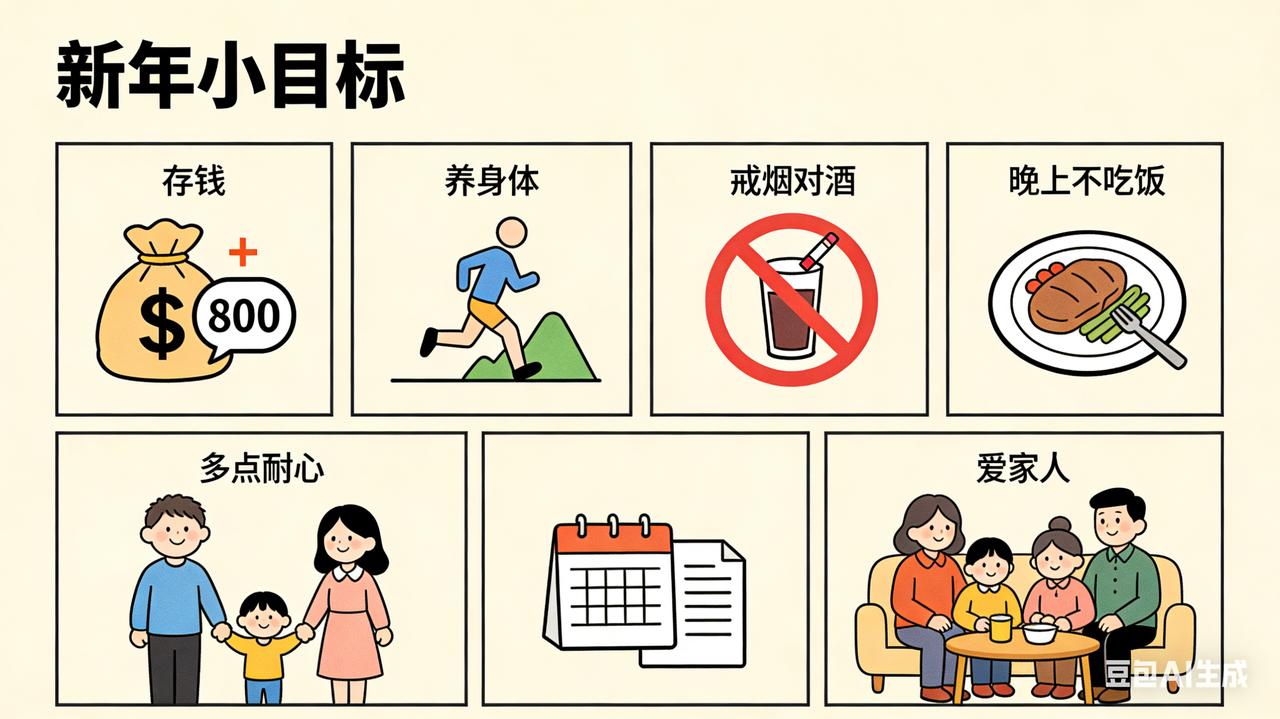 2026你的目标是什么呢?我的7个小目标,简单好实现,分享一下,看看适不适合你呢? 2025总算过完了,没啥大富大贵,就明白一个理儿:日子不用瞎折腾,把小事做好就赢了。 今年就盯7件事,全是实实在在的: 1.存钱:每月工资到账先抠800存起来,少点外卖少买没用的,再琢磨个小副业,每月多赚500就行,积少成多也是底气; 2.养身体:每天早起30分钟下楼溜达溜达,周末和家人爬个小山,锻炼锻炼身体? 3.戒烟戒酒:人到中年,自己的身体最重要,一直以来戒烟戒酒反反复复,从2026开始第一天全部戒掉,让老婆孩子监督。 4.晚上不吃饭:晚上吃过饭后,睡觉难受,以后自己一天就吃早饭和午饭,不吃晚饭了。 5.多点耐心:对待孩子的教育和生活习惯多点耐心,不吼不叫,放平心态。 6.兼职:找个兼职,工资不求多少,不虚度光阴。 7.爱家人:多陪陪家人,珍惜在一起的美好时光。 2026不盼啥大逆袭,就想一步一个脚印,把小日子过舒坦! 你们今年都有啥小目标?评论区唠唠,互相鼓鼓劲! 2026我的小目标 打工人新年计划