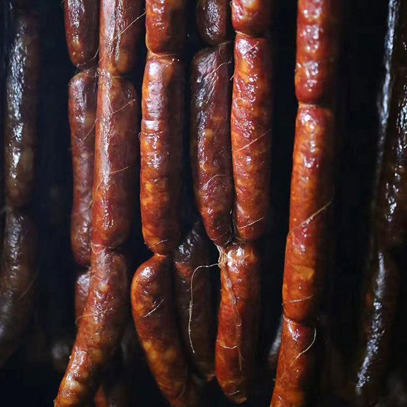 烟熏香肠,川味食品的顶端美食,立早记每年都在做的腊味系列,经过跑工厂沟通细节,多次测试样品口味达标才上架,全部新鲜肉制作,有微麻辣香肠、麻辣香肠和排骨香肠,都很好吃!跟自己家里做的味道一样,38元2袋共400g四川烟熏麻辣香肠/排骨香肠都是新鲜肉制作,不是冻肉做的香肠可以比的,价格都差一大截,去工厂参观时一整间屋子的新鲜猪肉,那场面之壮观,对品质有追求的朋友可以试试,市场十多二十块一斤的香肠大家可以谨慎一些。排骨香肠和烟熏香肠一样,精选鲜货猪肋排,肥瘦黄金比例,可不是边角余料。每一口都能能咬到实实在在的肋排肉,骨肉轻松分离,既能体验啃骨的快感,又有大口吃肉的满足,非常过瘾了。现在城市已经没有自己秌香肠腊肉香肠的条件了,制作工艺上,依然是要求工厂沿用传统柏木烟熏3-5天,慢工出细活让香气丝丝入肉,也让排骨和香肠从里到外都披上一层漂亮的琥珀色,再加以各种调料,带着迷人的烟熏复合香气。入口后是经典的川味麻辣和烟熏味层层递进,兼具香肠的香辣油润与排骨的扎实鲜美,越嚼越香!真空包装设计,方便储存也方便携带,不管是在家解馋、下酒追剧,还是用来招待客人,都是绝佳的选择。这个好物闭眼入