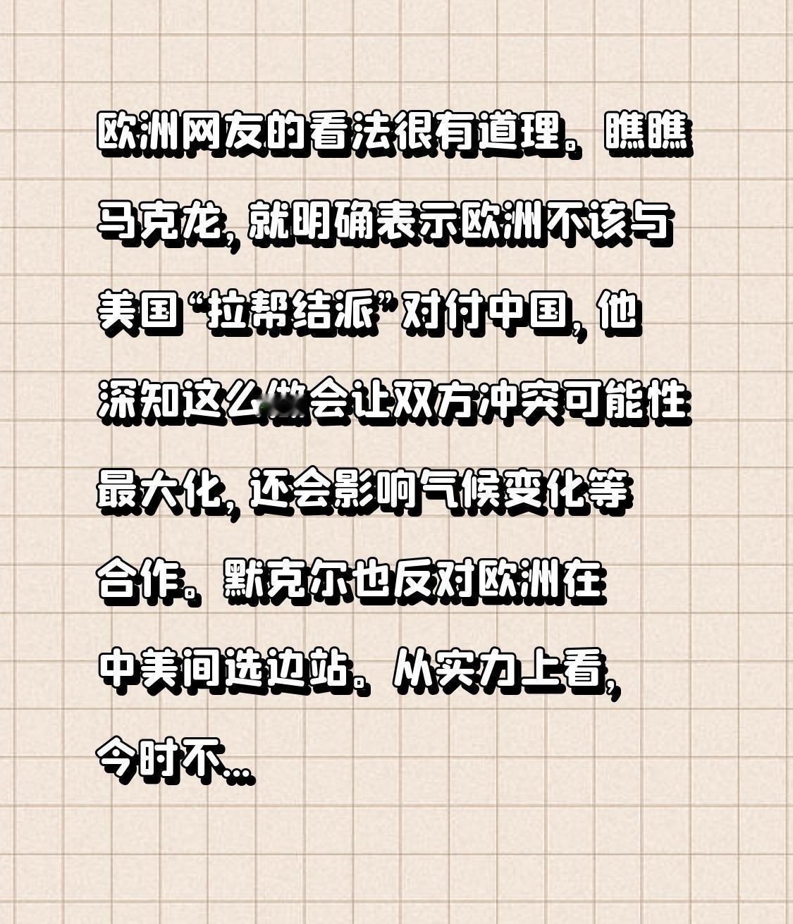 欧洲网友的看法很有道理。瞧瞧马克龙,就明确表示欧洲不该与美国“拉帮结派”对付中国,他深知这么做会让双方冲突可能性最大化,还会影响气候变化等合作。默克尔也反对欧洲在中美间选边站。 从实力上看,今时不同往日,中国用几十年追平西方几百年发展,还赶超了欧洲。中国面积广袤,人口达十四亿,而欧洲虽总面积略大,但近半属于俄罗斯。人口上欧洲难以突破十亿还负增长。事实证明,欧洲领导真该有主见,和中国交好,毕竟中国强世界强。