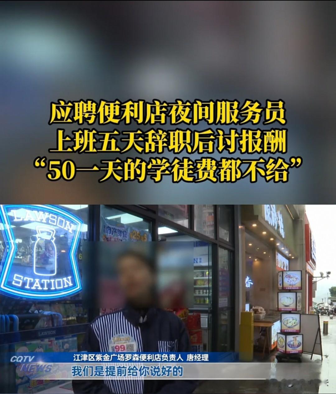 重庆,女子应聘便利店工作,干了五天后辞职。双方原本约定,没学会时,就按50元/天的学徒工资结算,可最后连这250元,老板也拒不支付,还说:“我们本来一个人就能干的活,你应聘来后,我们还得专门配备一个师傅教你,这已经产生额外开支了,凭什么还要给你钱?” 女子年纪轻轻、长相漂亮,只因最近工作不好找,便降低了求职标准,应聘了这家便利店的夜间服务员岗位。 当时老板告知她,需要长期工,但入职初期都要先实习,期间可双向选择。等她学会技能、试用期满后,才能按正式员工标准发放工资;实习学习期间,只能按50元/天的学徒工资结算。 女子觉得服务员的工作不难,便答应了,在24号晚上准时到岗上班。可真正干起来才发现,这份工作远比想象中更难、更累——既要洗东西,又要上下货,琐事繁杂。 经过深思熟虑,女子还是在29号提出了离职,第二天就没再去上班。她希望老板能结算这五天的工资,可对方却始终不肯,还说:“你学都没学会,我凭什么给你钱?” 虽然250元不算多,但女子认为自己付出了劳动,就该拿到相应报酬,于是找来记者帮忙讨要说法。 可老板见到记者一行人,依旧不为所动,说什么也不肯给钱。记者有些不悦,质问道:“女子在你这里干了五天,这是事实,你为什么不给她钱?” 老板却狡辩:“她现在已经不在我这里干了。” 记者都觉得好笑:“她之前明明在你这干了五天,店里有监控为证,你不能说假话呀!” 老板解释道:“那五天她压根没学会技能,我凭什么给她钱?” 他还补充说:“本来我们一个人就能完成的工作,她要来应聘,我们还得专门找个师傅教她,师傅的工资我们要付,要是再给女子发工资,我们就亏大了!” 可女子也不能白干活呀!她反驳道:“当初说好的,没学会就按50元一天算,你不能说话不算话!” 老板再次辩解:“50元一天的学徒工资,是要求你长期干的——至少干一年以上,我们都不愿意招只干一两个月的。你才干了五天就走,我们凭什么给你钱?” 大家这才明白,老板的真实意思是:只有长期干(至少一年以上),没学会技能的期间才算学徒工,按50元/天结算;可要是你不长期干,哪怕在学徒期内,也不算数,所以不能给钱。 但这种说法显然站不住脚,哪能以这样的条件约束别人呢? 当初明明说好“双向选择”,试用期就是让双方互相考察的阶段,员工有选择辞职的权利,不适合自己就可以提离职,要不然怎么叫试用期呢? 可老板还是不愿意给钱,哪怕只有250元。在他看来,为了教女子,专门配备了师傅,要是再支付这笔学徒工资,自己就亏了,不划算。 但作为老板,招聘员工本身就是一个双向选择的过程——员工在选择雇主,雇主也在筛选员工。这期间产生一些正常的开支和损耗,是情理之中的事,不能把所有压力都推给前来应聘的人吧? 所以大家都认为,这笔钱老板肯定该给,而且必须给。不能因为自己可能亏钱,就违背当初的承诺,不然以后谁还敢来你这里应聘呢? 一、女子去那里上班了五天,就与对方形成了劳动关系,没有任何劳动关系会规定干了活不给钱 《劳动合同法》第七条:用人单位自用工之日起即与劳动者建立劳动关系。 《劳动合同法》第三十条:用人单位应及时足额支付劳动报酬。 女子提供5天劳动,双方约定50元/天工资,劳动关系成立。便利店以“没干满长期”“没学会”拒付,违反“劳动即获报酬”原则,于法无据。 二、女子在不会的时候,肯定是要配备师傅教的,这是店家配备新人的正常开支,不能够因为这个而拒绝支付女子50元一天的报酬 《劳动法》第五十条:不得克扣或无故拖欠劳动者工资。 《劳动合同法》第十一条:双方明确约定工资的,按约定执行。 店家配师傅属正常经营成本,与劳动者无关。双方已约定50元/天报酬,店家以“付师傅工资”拒付,既违约定也违法。 对于老板不支付女子250元的情况,大家怎么看? 素材来源于天天630,于2026年1月1日报道