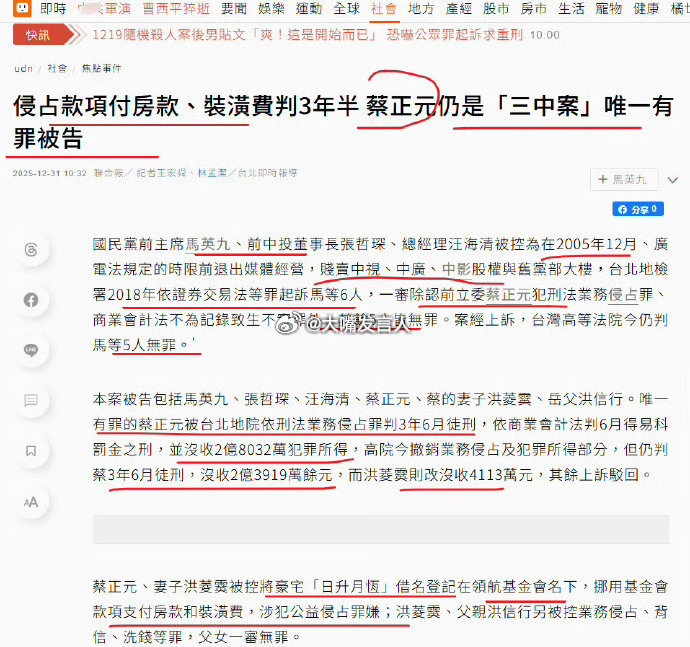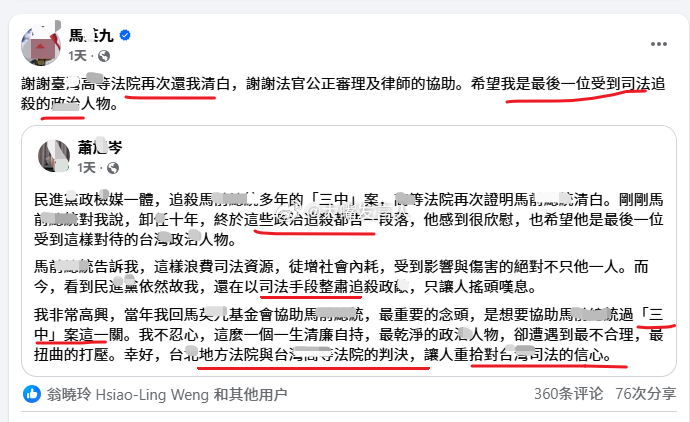 没有提蔡正元一个字(图1)对于岛内三中案,二审仍然判罚马英九无罪(蔡正元3年半刑期),萧旭岑说,“幸好,岛内二级法院的判决(马无罪),让人重拾对岛内司法的信心”,马英九说希望自己是最后一位受到司法追杀的政治人物。对于这次二审终审判决,被判三年半、两个月后就要去服刑的蔡正元说,这是政治迫害(图2)、蔡被诱导“咬”马。然而,萧、马对这次判决,没有提蔡一个字。他俩为什么不提蔡、不评论,就各说各话了。热点观点 ,张维为预测台湾没有一下次大选了 ,希望台湾同胞自觉与台独划清界限