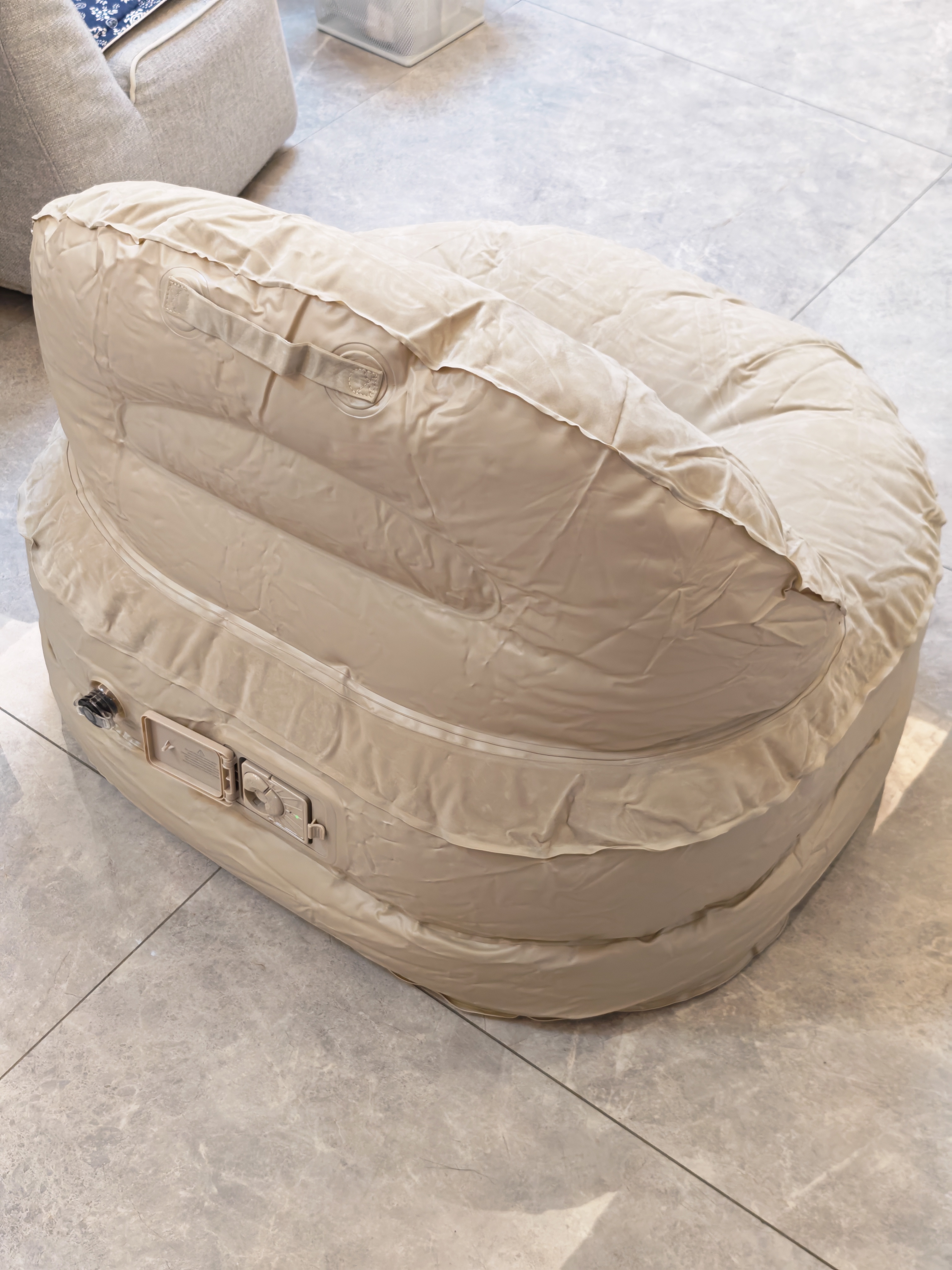 99块钱理想商城秒杀的充气沙发自带充放气泵,电动设计几十秒时间看着从一块板砖膨胀